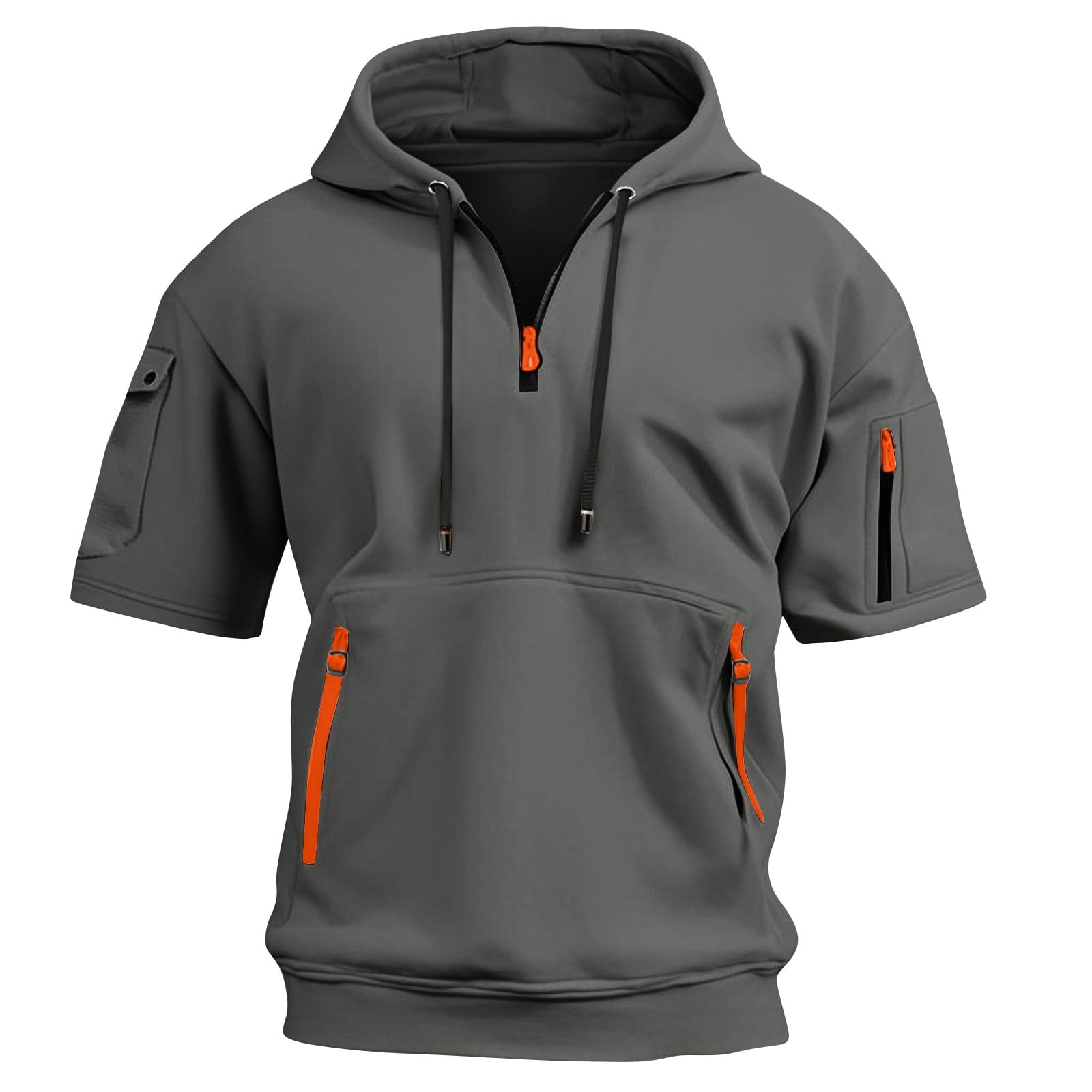 【Design】This short sleeve hoodies for men features a classic drawstring hood style, short sleeve, 1/4 zipper placket, multiple pockets, ribbed cuffs and hem, and has elasticity and enhanced freedom of movement.