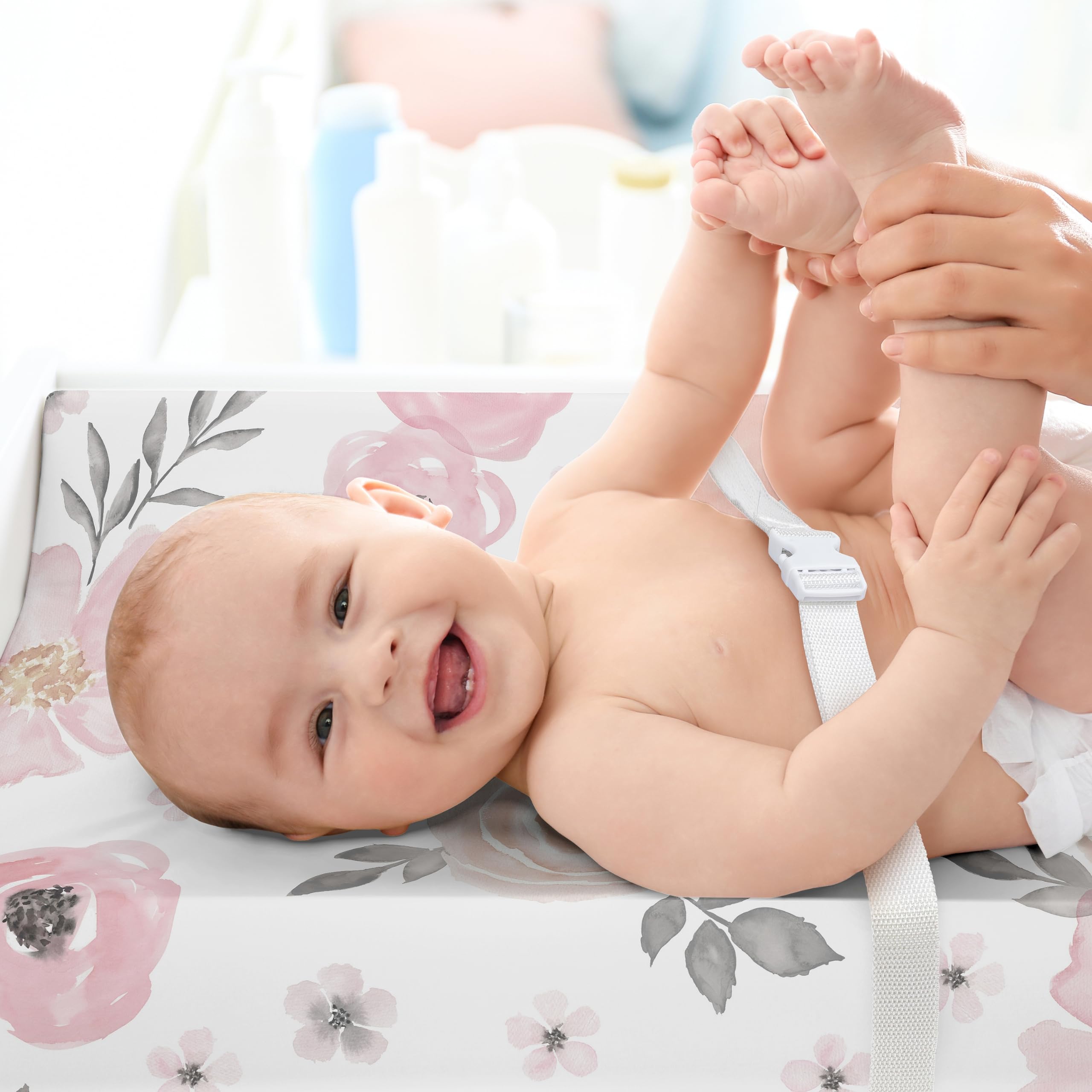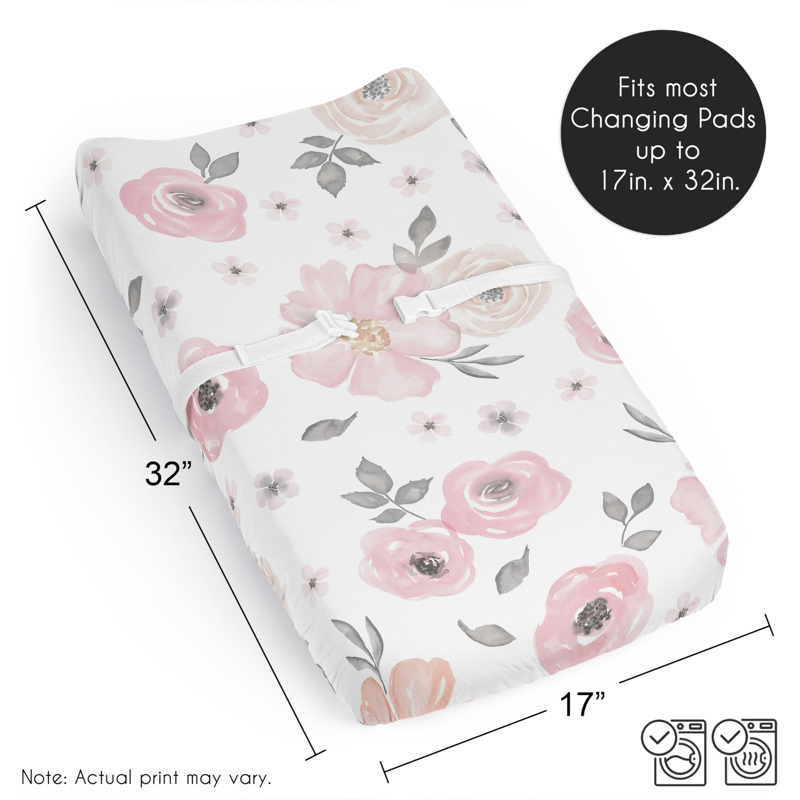BABY ITEMS MUST HAVES: Diaper Changing Pad Cover Sheet (17in. x 32in.). Designed in the USA with moisture wicking, super soft brushed microfiber fabric. Machine washable, tumble dry low. This vibrant changing pad cover case sheet for girls would pair perfectly with coordinating bedding sets and match with the Blush Pink and Grey Watercolor Floral Flower Rose Floral Collection accessories to complete your newborn/infants nursery themed look.