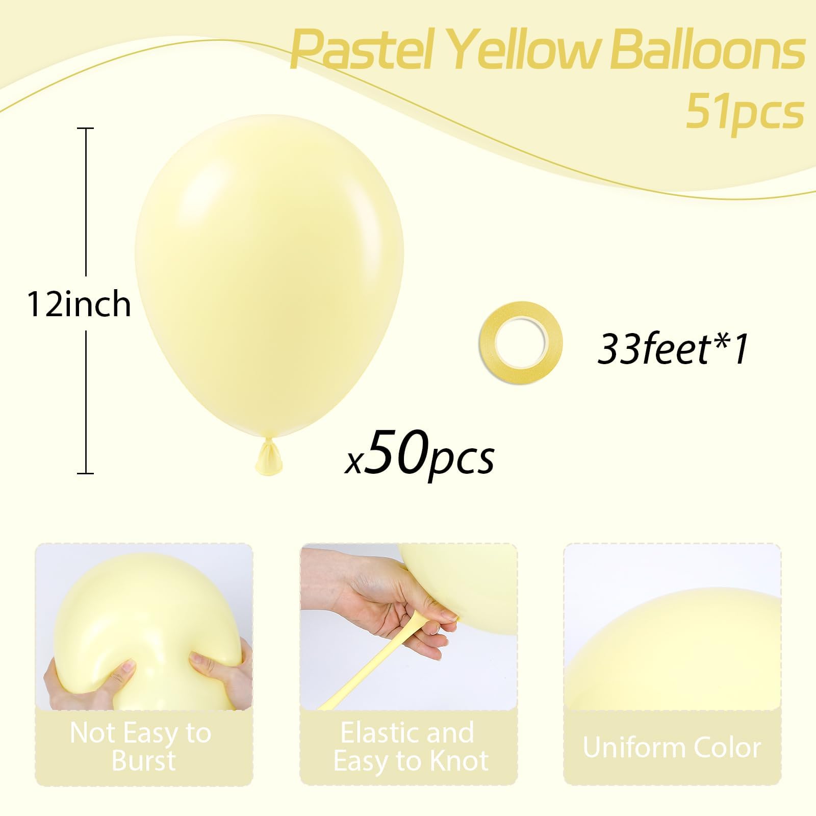 Package Include: The package include 50pack 12 inch pastel yellow balloons and a roll of yellow ribbon