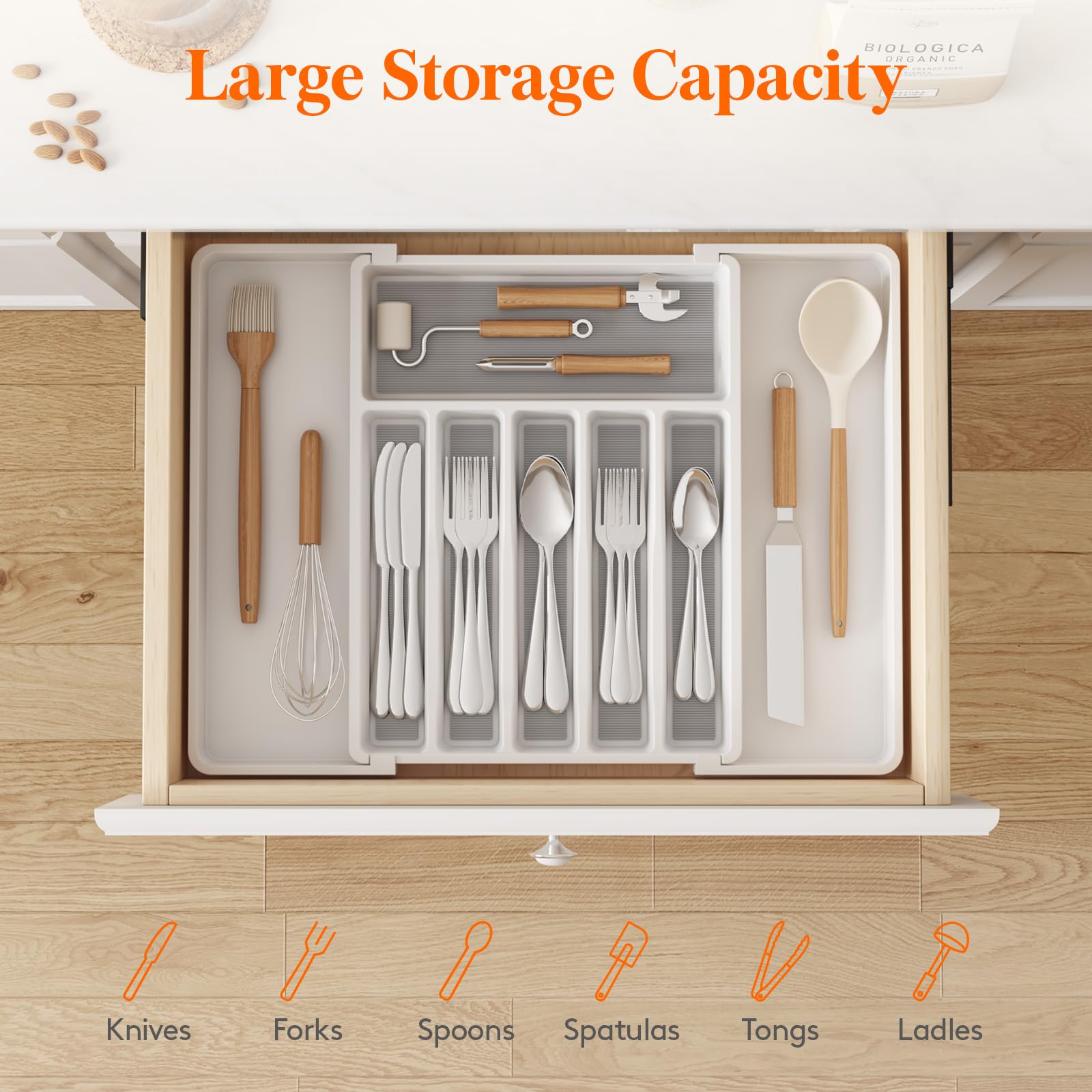 Large Capacity: This cutlery drawer organizer features six middle compartments and two expandable side panels to maximize storage space for utensils, cookware, and various kitchen items, keeping your kitchen drawers tidy