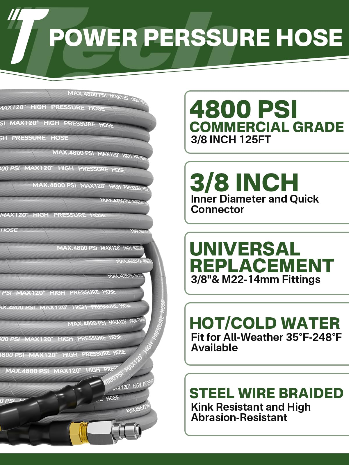 【125FT Powerful Washing Hose】Upgraded high-strength steel wire braiding and German engineering redesigned 125-foot hose, kink-resistant, wear-resistant, with a bend radius of less than 3 inches, 50% more flexible than cheaper hard hoses, easy to drag, fast moving. Working temperature 35°F to 248°F (0°C to 120°C), suitable for all-weather use, suitable for hot and cold water use, easier and faster to remove heavy dirt.