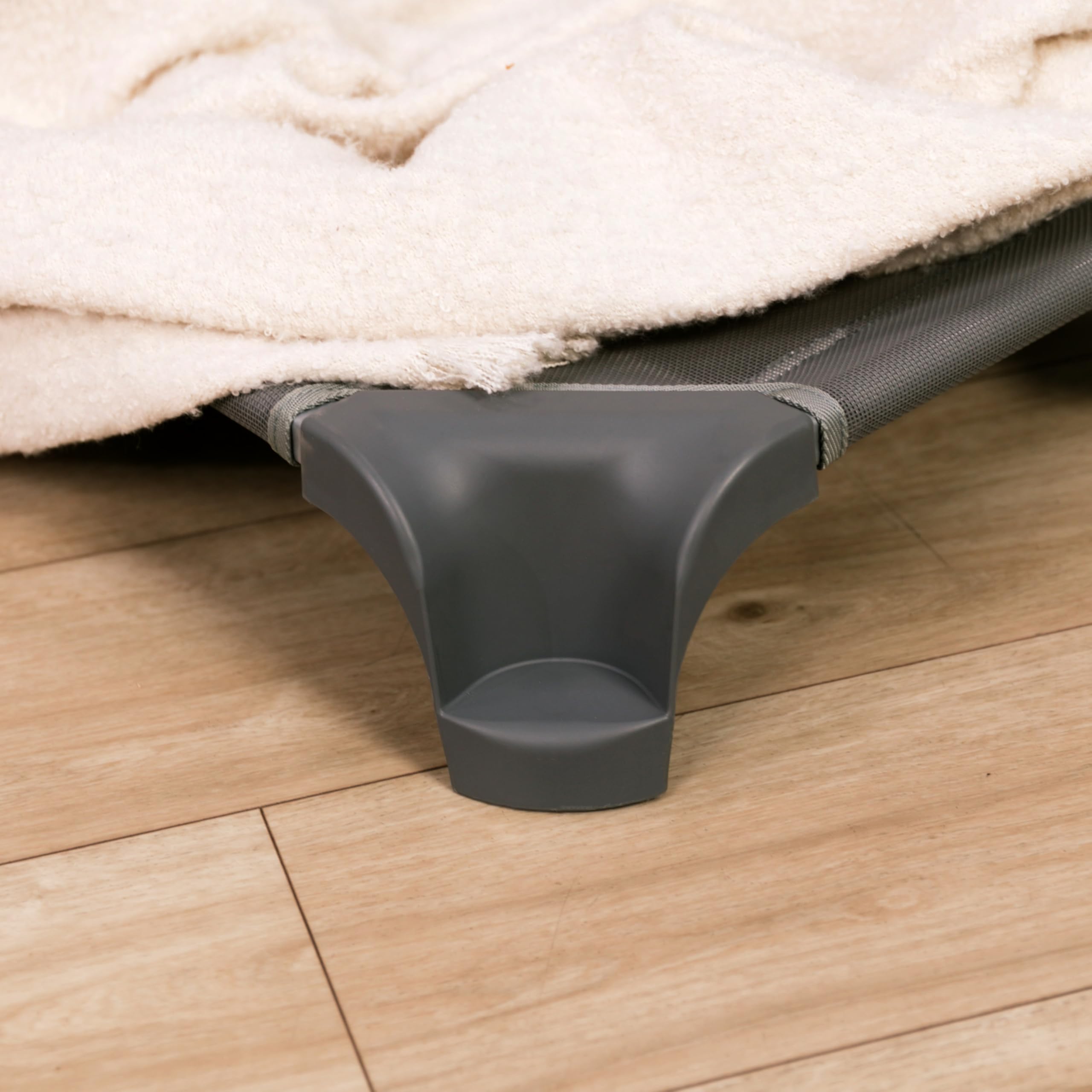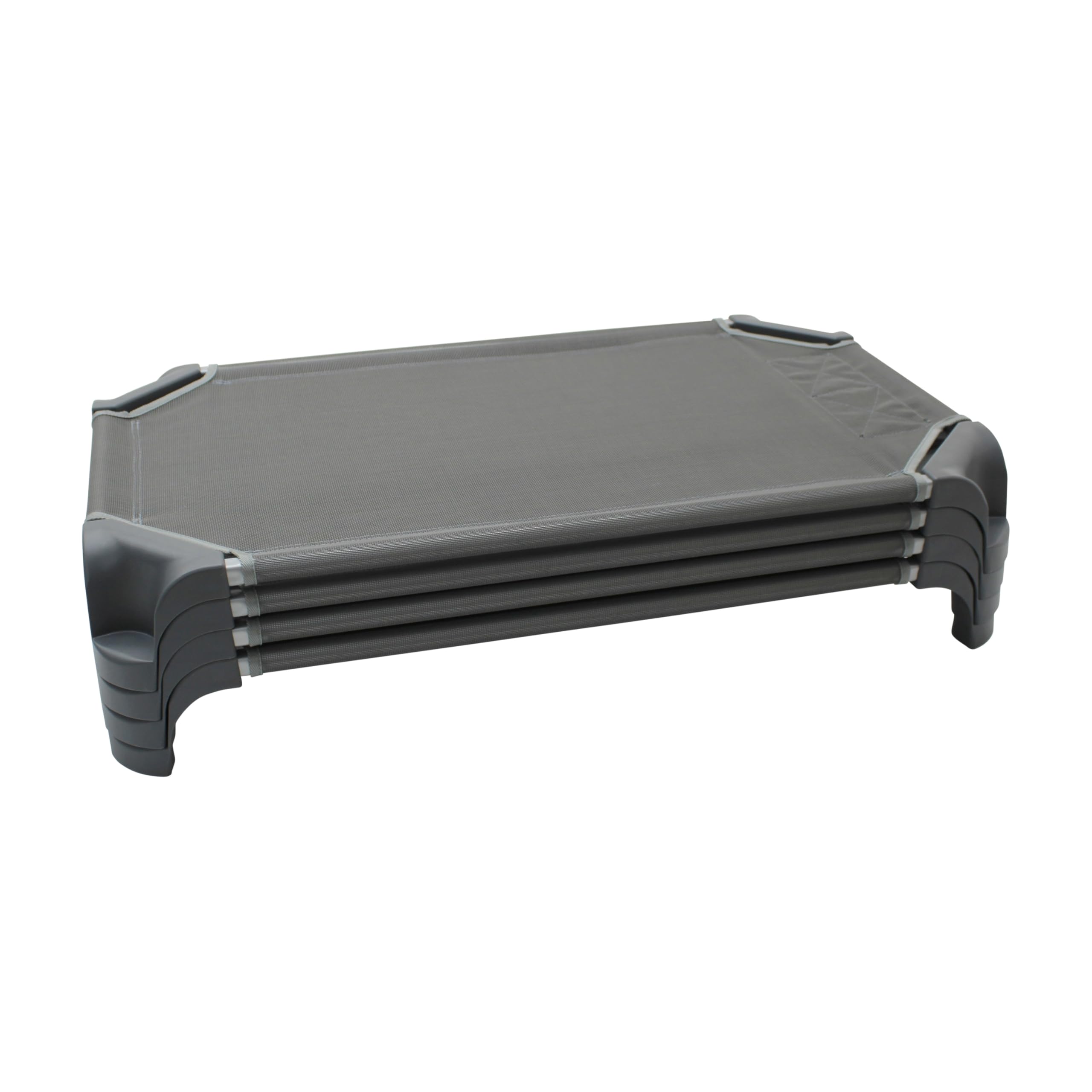 STACKABLE DESIGN: waterfall-style cot corners nest together for space-saving efficiency and can be stacked up to 12 high