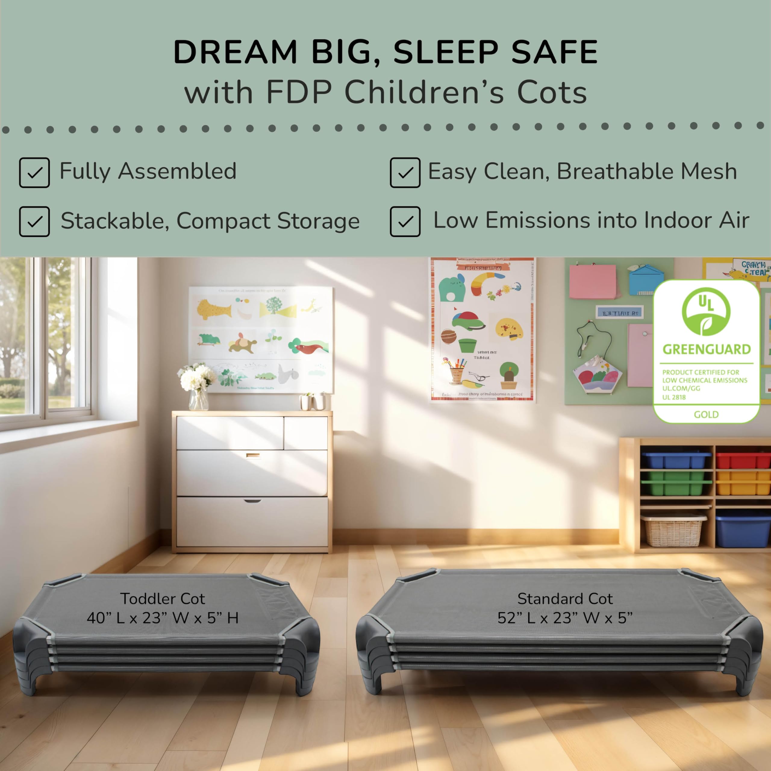 SAFE FOR YOUR SPACE: GREENGUARD Gold Certifiedfor low emissions into indoor air, complies with flammability regulations and state naptime standards and regulations