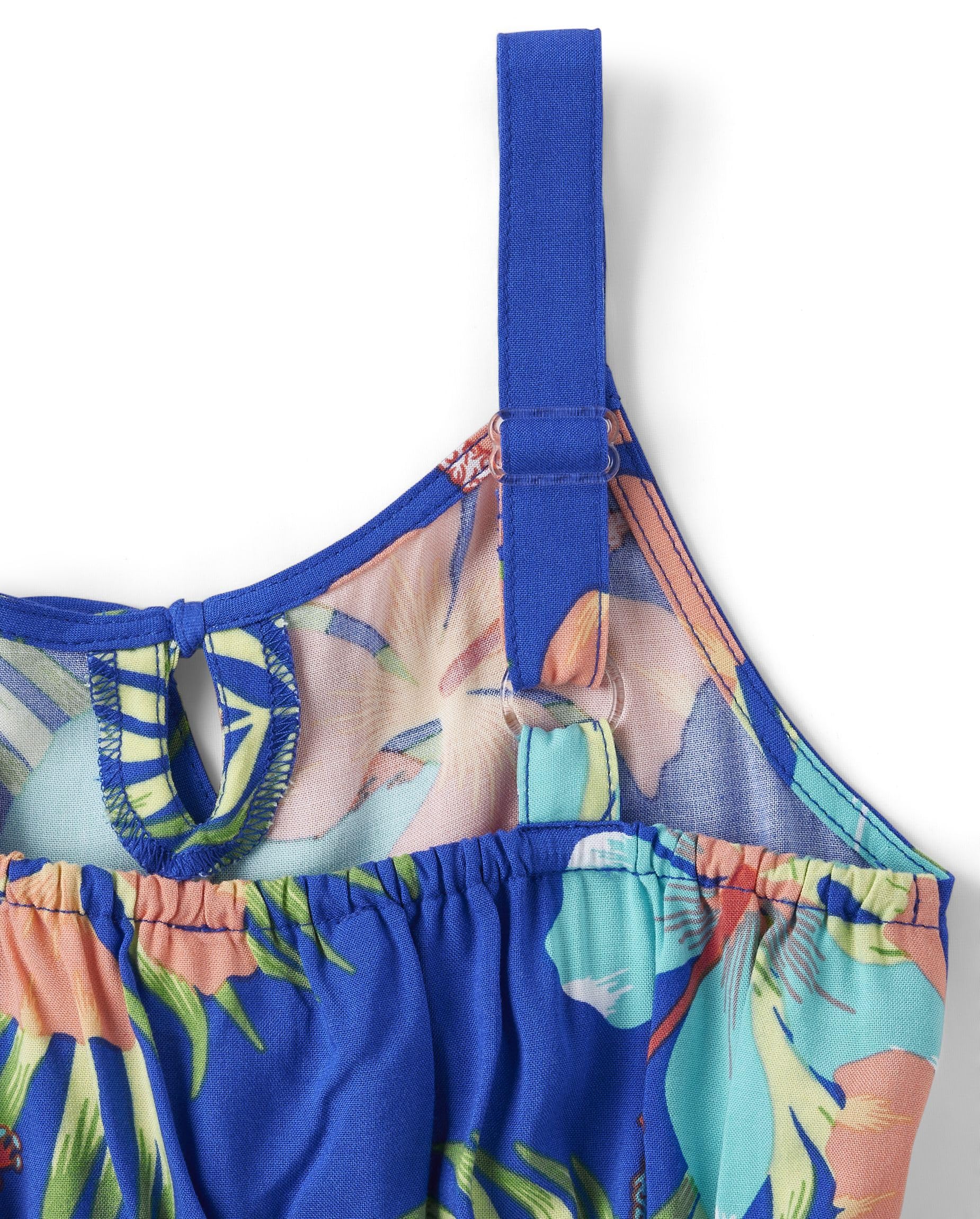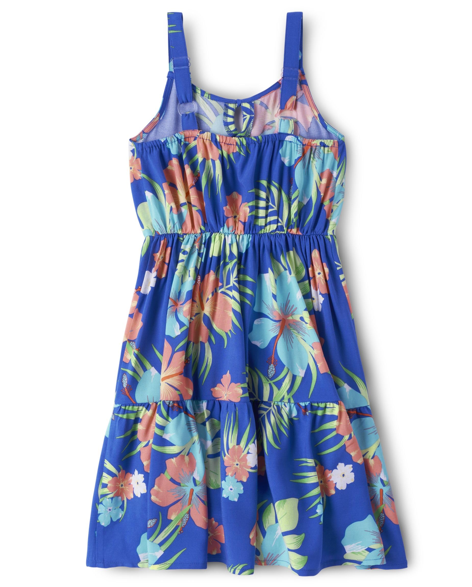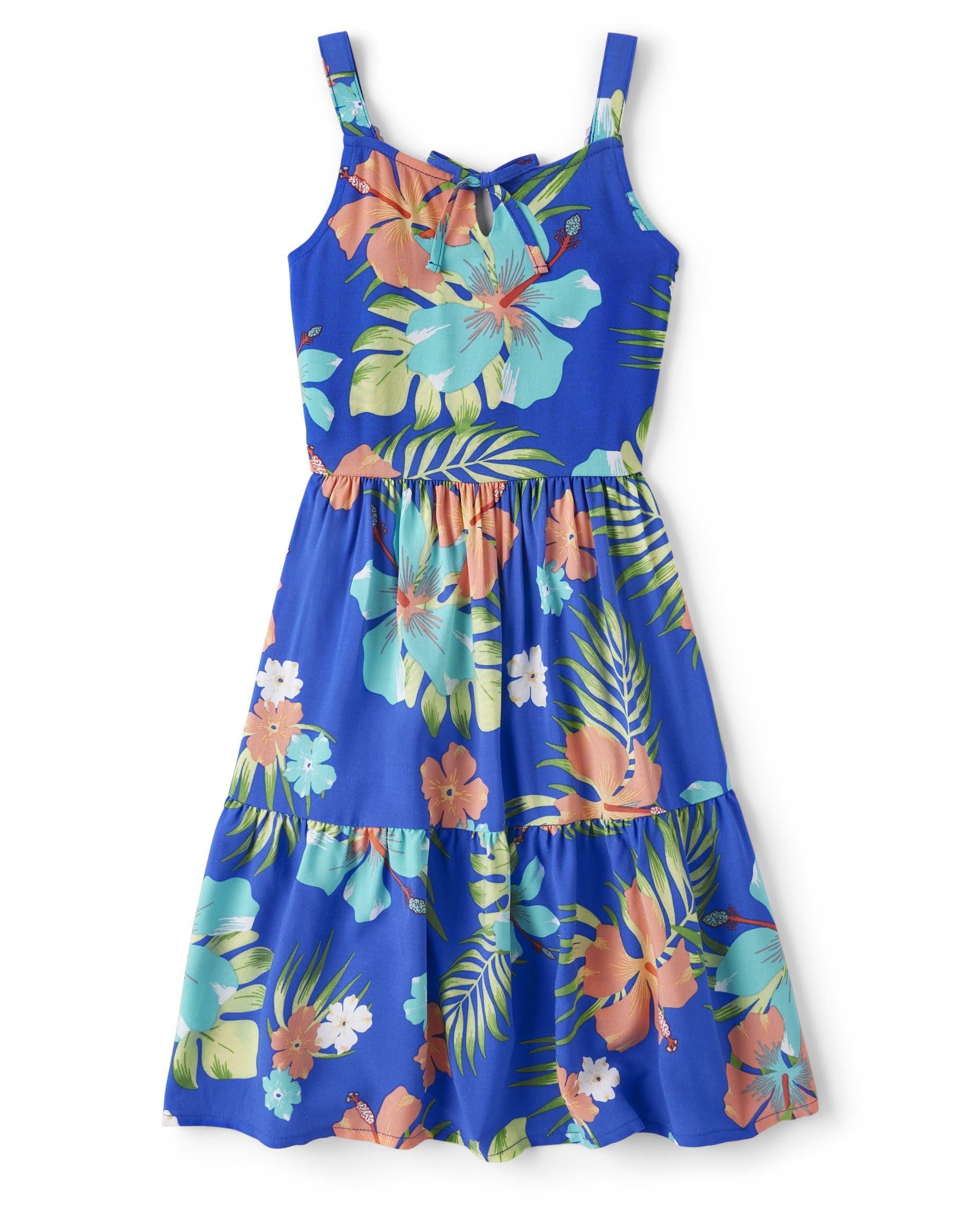 DESIGN β Features keyhole cutout with non-functional bow at front, tiered body, midi length and allover tropical floral print