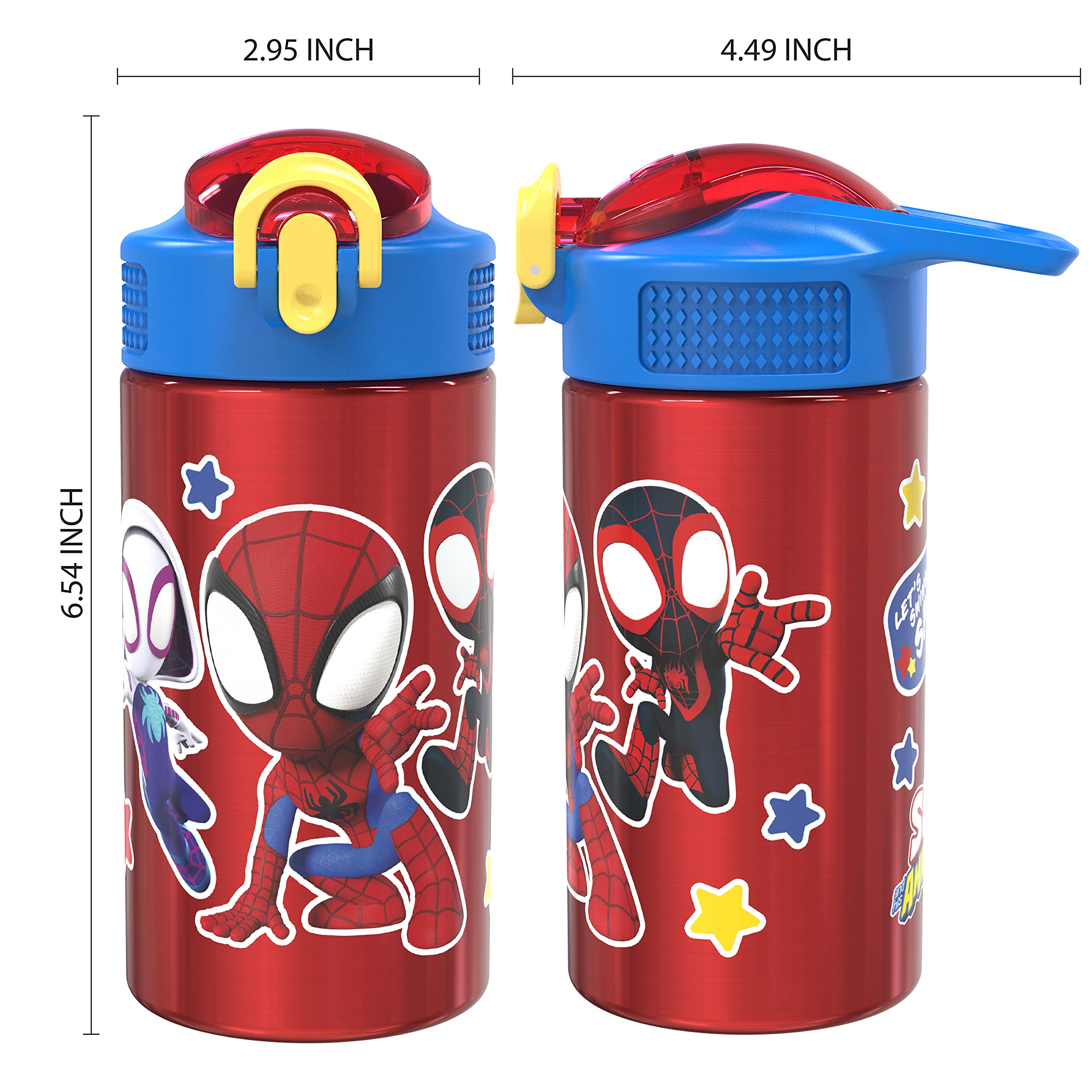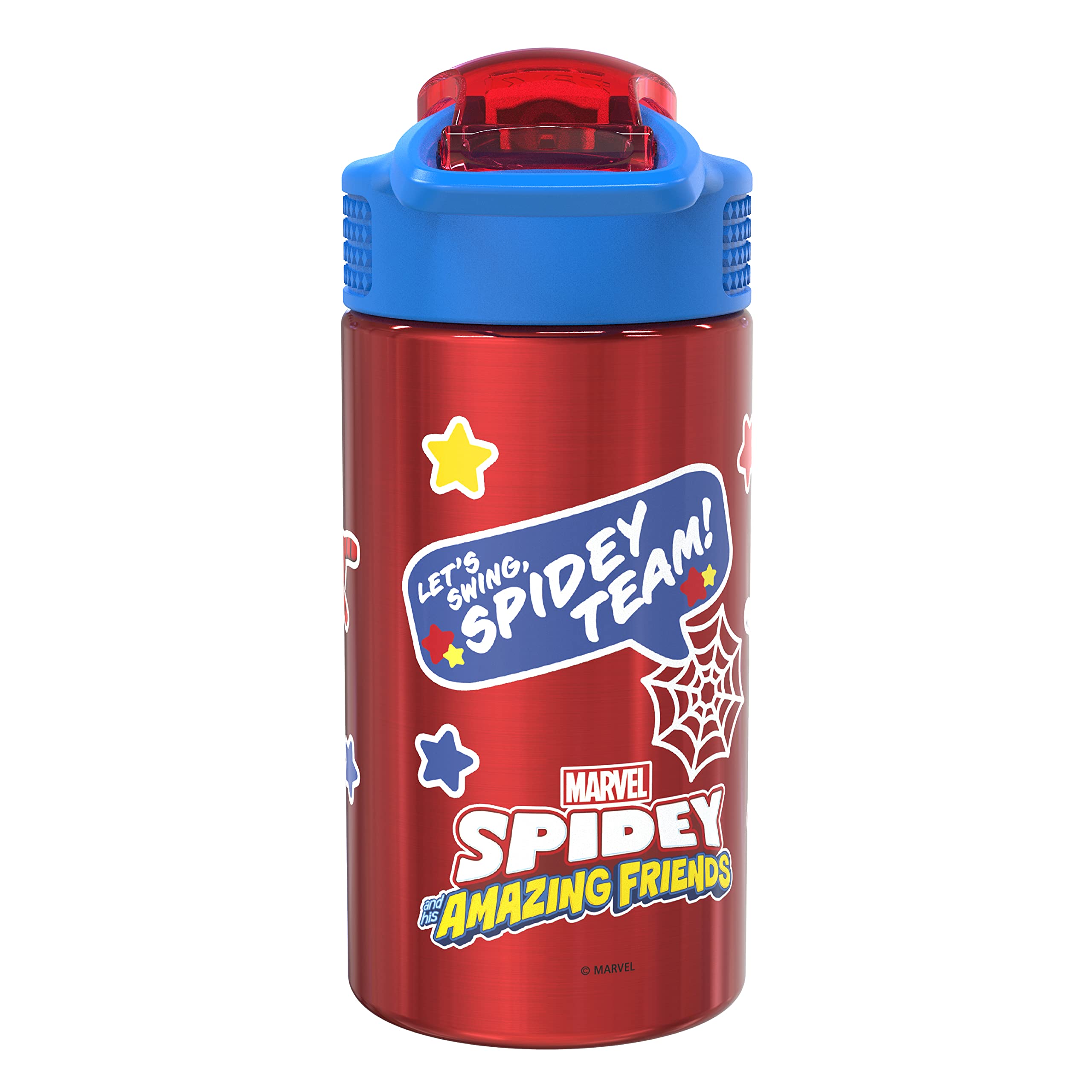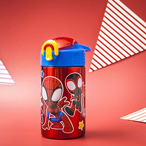 "This reusable water bottle from Zak Designs makes hydration fun for any Spider-Man fan! Durable Stainless Steel: The 15.5-ounce water bottle is made from single-wall, 18/8 stainless steel, which is food grade quality as well as durable and break-resistant. All materials are completely BPA free. Hygienic Spout Cover & Action Lid: The screw-on lid has a silicone spout with a cover to keep it clean, and a flip-up lock to make sure the cover stays closed. The lid is leakproof when the spout cover is closed and locked, but can be easily opened one-handed with the push of a button. On the Go: The carrying loop built into the lid makes the bottle easy to carry, and you can put it in a bag or backpack without worrying about spills. The bottle also fits in most car cup holders. Specifications: 15.5 oz capacity. Made of durable, 18/8 stainless steel. BPA free - Zak is committed to safety. Hand washing recommended, do not microwave. Length: 4.3-inch, Width: 2.8-inch, Height: 6-inch. Character: Marvel Spider-Man (Spidey and His Amazing Friends)."