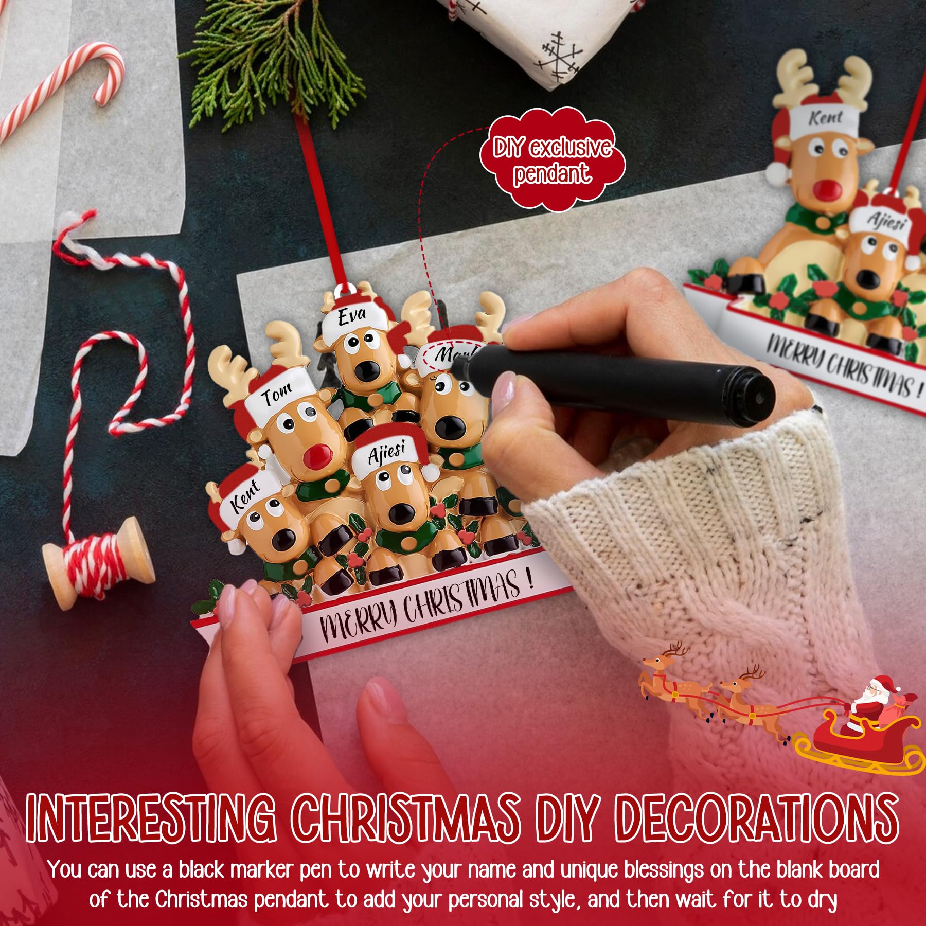 DIY Christmas Ornament: Personalize your family Christmas ornaments with ease! Use a marker pen to write family members' names or unique blessings on the blank section of the reindeer ornament, creating a memorable first Christmas ornament or family Christmas gift. If you make a mistake, simply use 91% alcohol to erase and rewrite. This custom Christmas tree hanging pendant makes your decorations more meaningful and lasting!