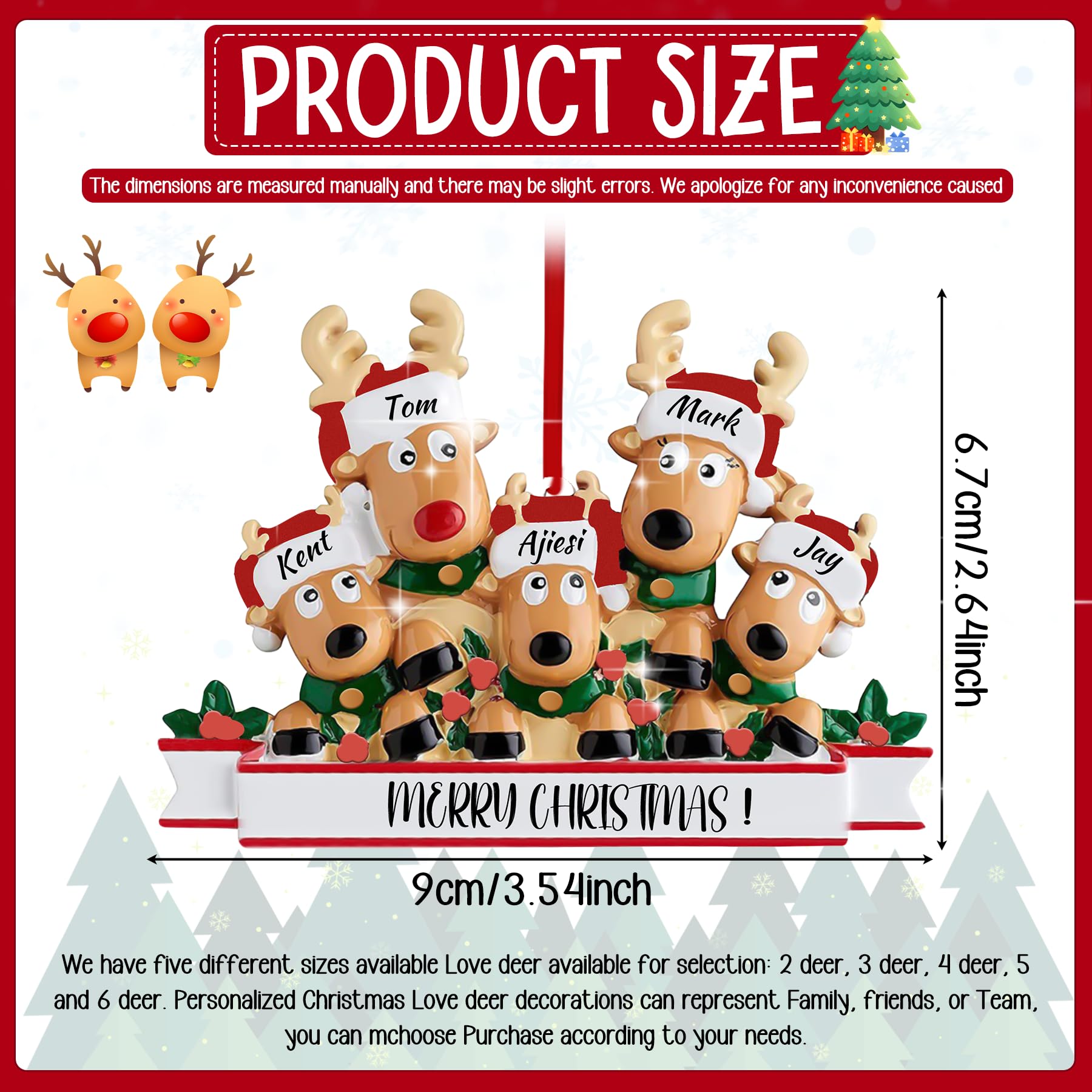 Optional Styles: Choose from a variety of personalized Christmas ornaments 2025—available in options with 2 to 6 reindeer heads, perfect as Christmas tree decorations that represent family members, friends, or teams. Each reindeer can symbolize a loved one, and you can add names or holiday wishes to make everyone feel special. This customized Christmas ornament allows you to share health, happiness, and warm wishes for the new year, adding a unique touch to your festive decor.