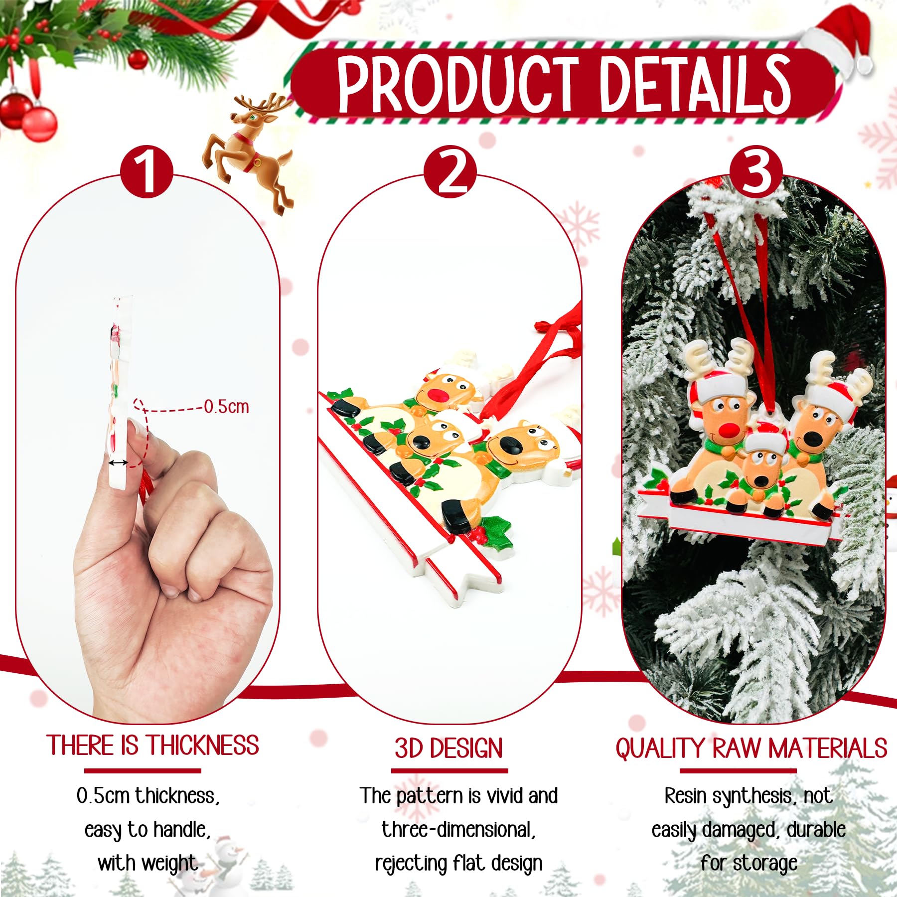 Versatile Christmas Decorations: Our reindeer family ornament comes with a sturdy red ribbon, making it easy to hang on walls, windows, fireplaces, doorknobs, or your Christmas tree. There indeer Christmas decoration is well-packaged to prevent breakage, ensuring it arrives safely and ready to enhance your holiday decor. Add festive flair and create a joyous holiday atmosphere with these vibrant Christmas tree ornaments.