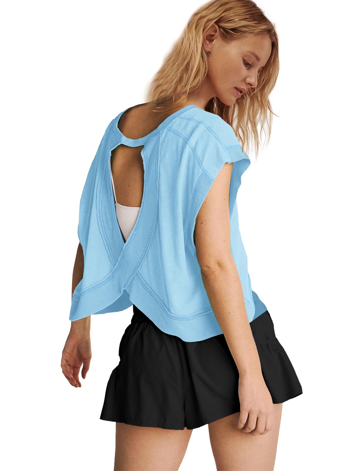 Occasion: Embrace comfort and style effortlessly. This short sleeve open back tops is perfect for going to or from a workout, this tee features a soft fabrication, slouchy crop and flattering back opening. Its adaptability blends seamlessly with your lifestyle.