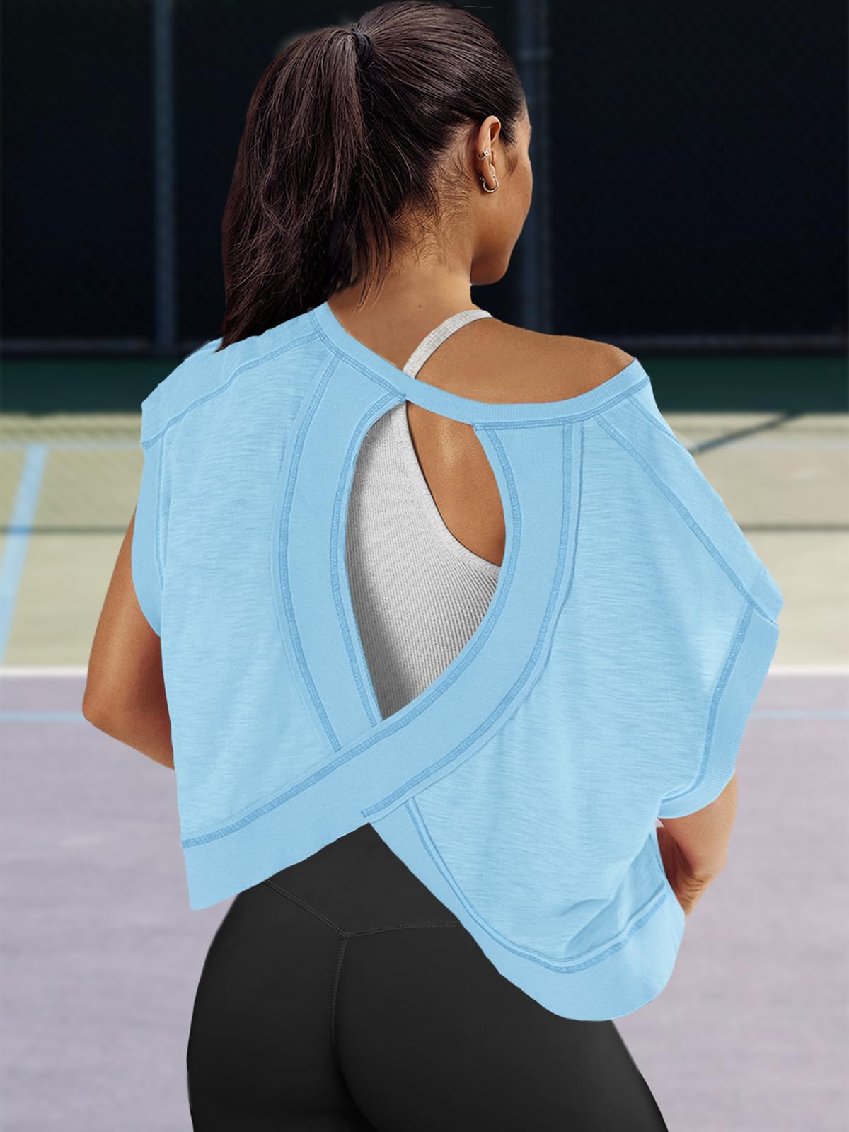 Fit: Please order your regular US size. The workout tshirts for women is an oversized style that not only flatters your figure but also pairs effortlessly with any outfit. If you want a more comfy loose fit for this womens open back tops, suggest ordering one size larger.