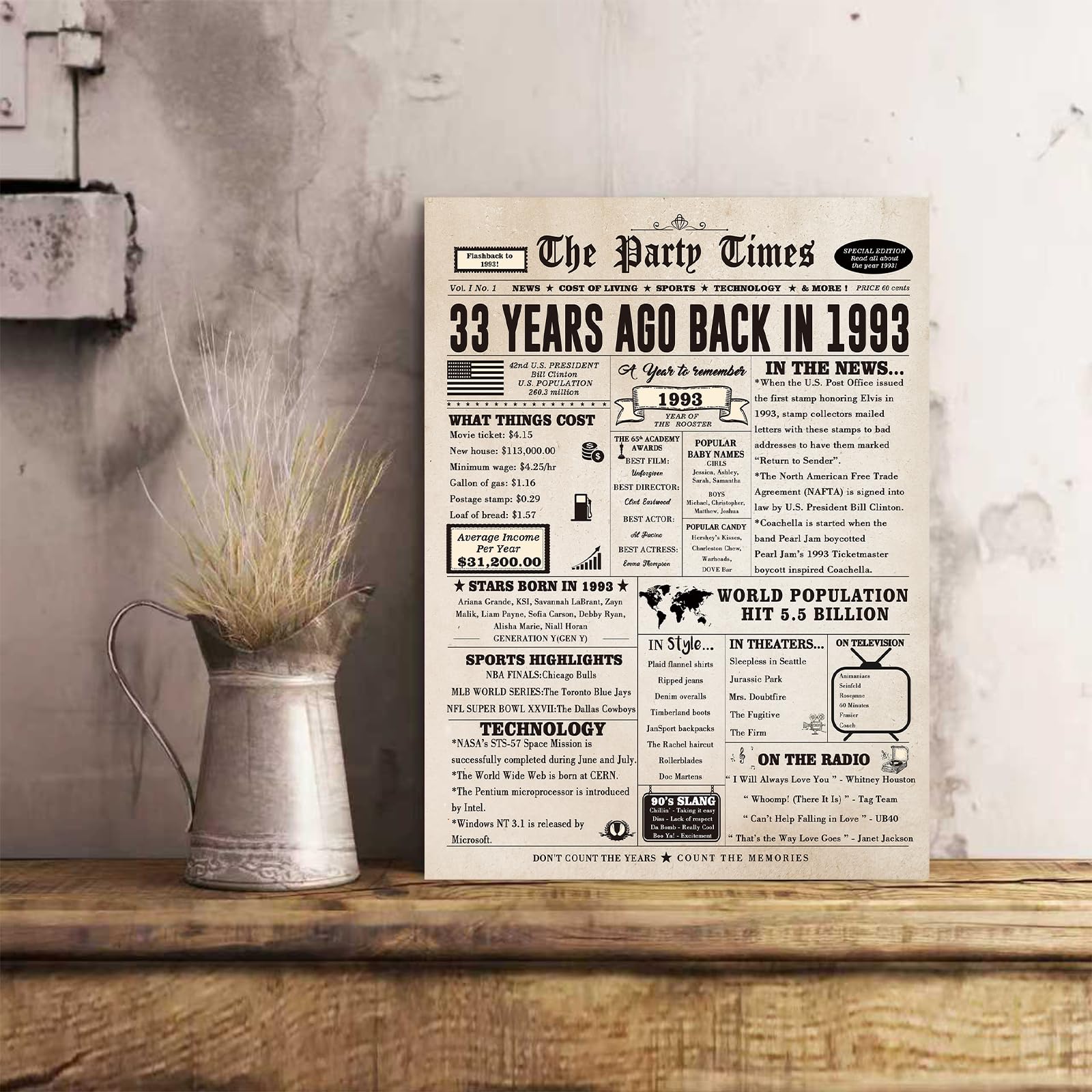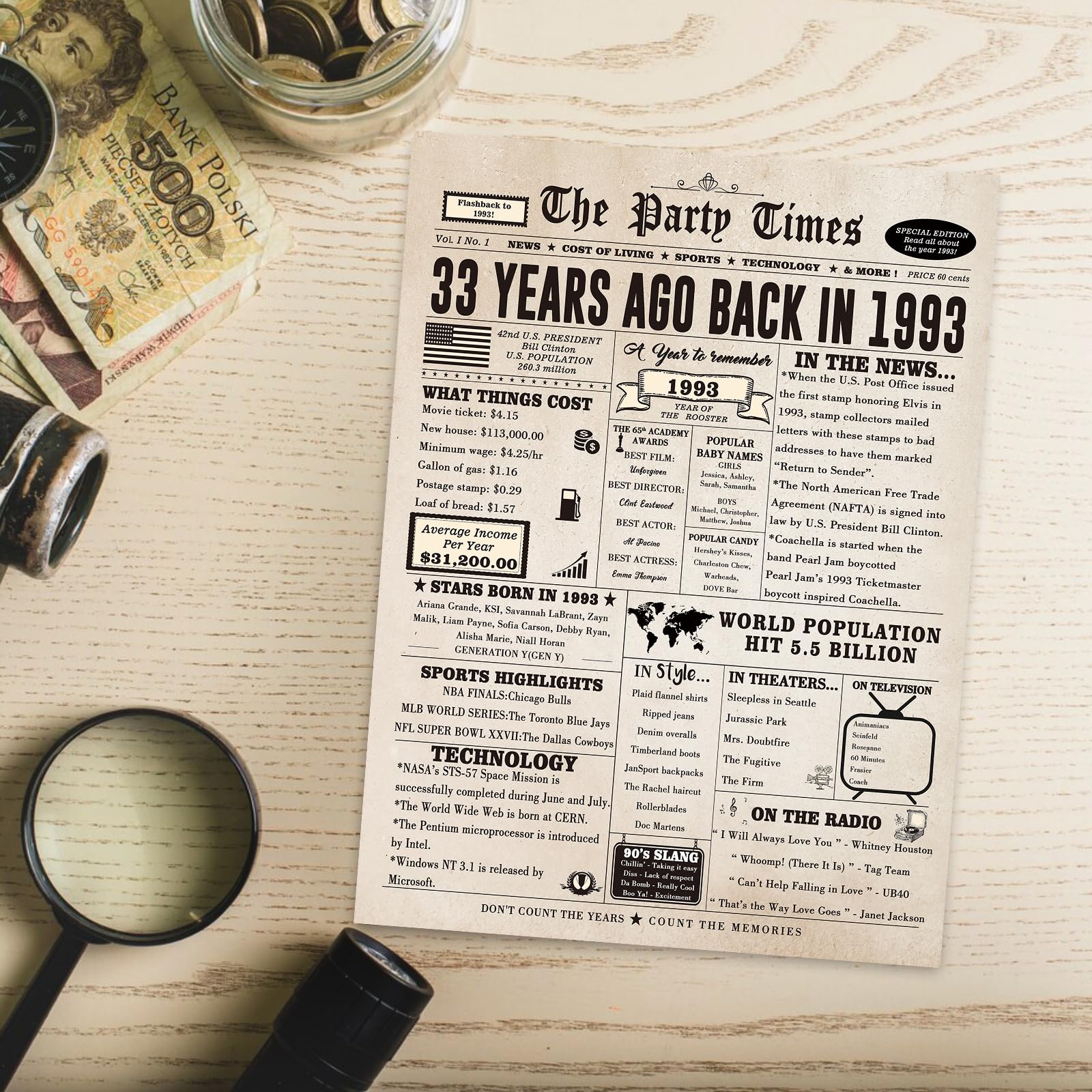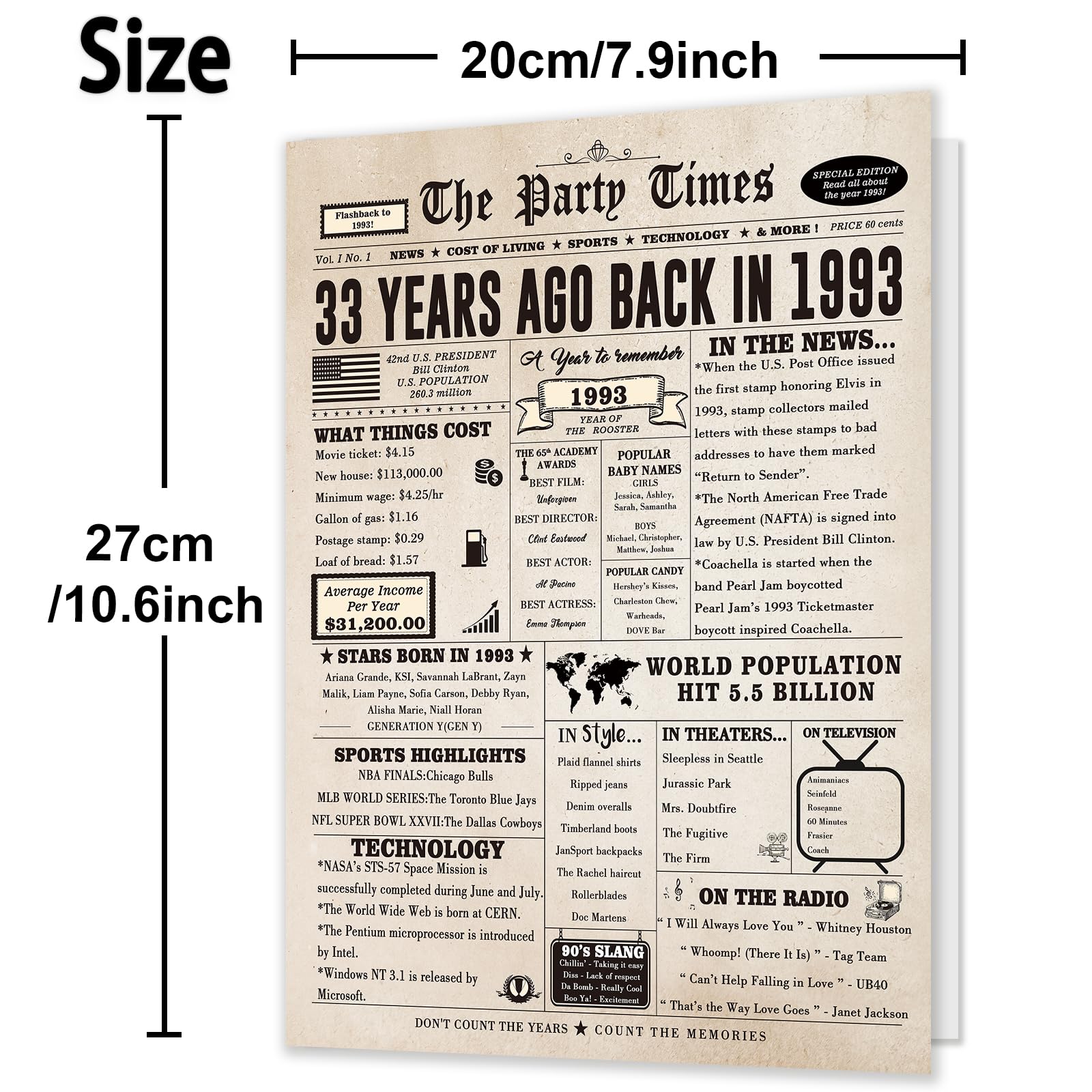 It's a great conversation piece. It's interesting to look back and see how much everything cost back then and the history of what was going on. An unique and memorable birthday gift when you don't know what to get for someone. The perfect remembrance to tuck in a gift box or gift bag. With its classic and retro style, this 33 bday card will bring a vintage touch to your home decorations, make your gift stand out. Ideal gift idea for your parents, father, mother, husband, wife, sister, brother, best friend, colleagues, classmates, teachers, etc.