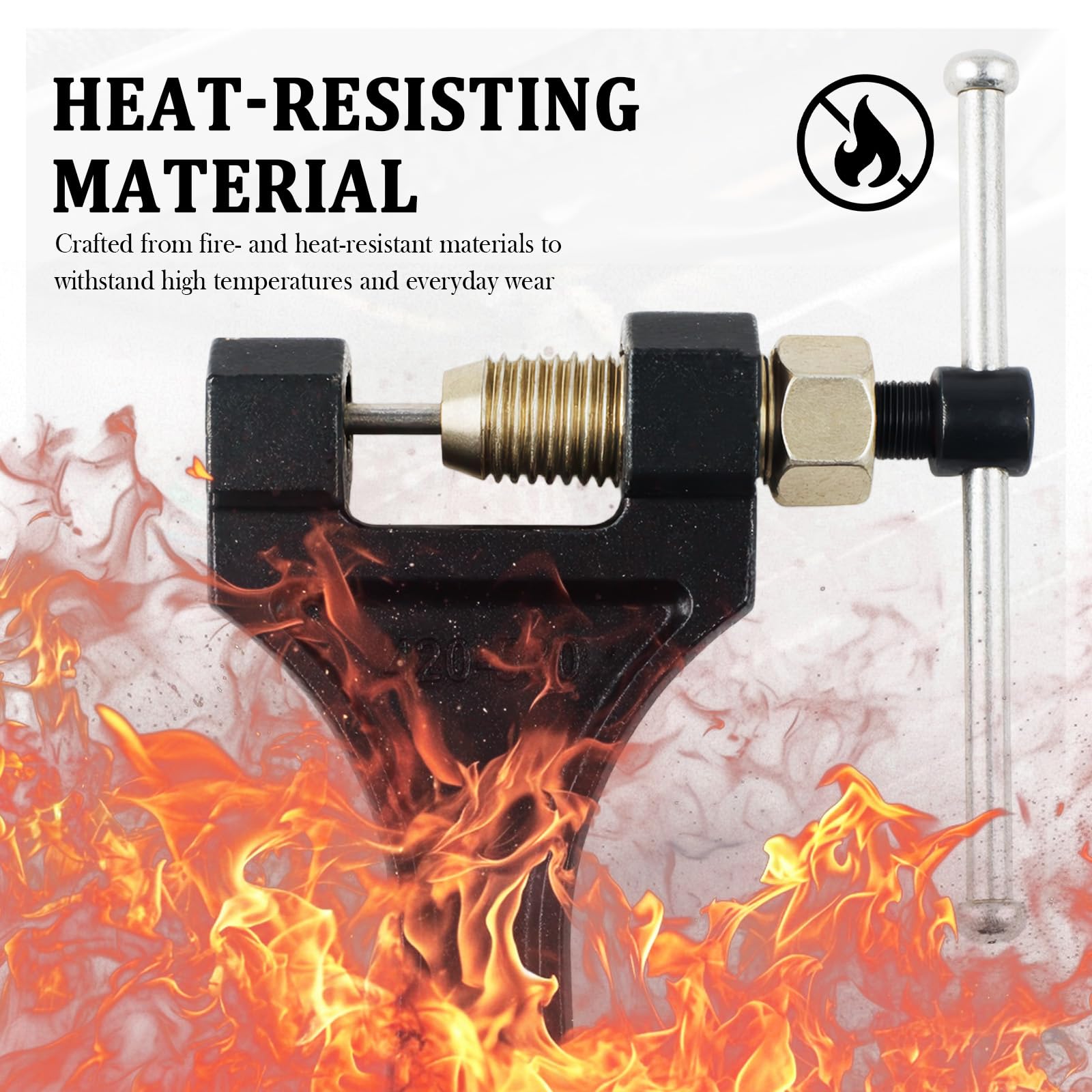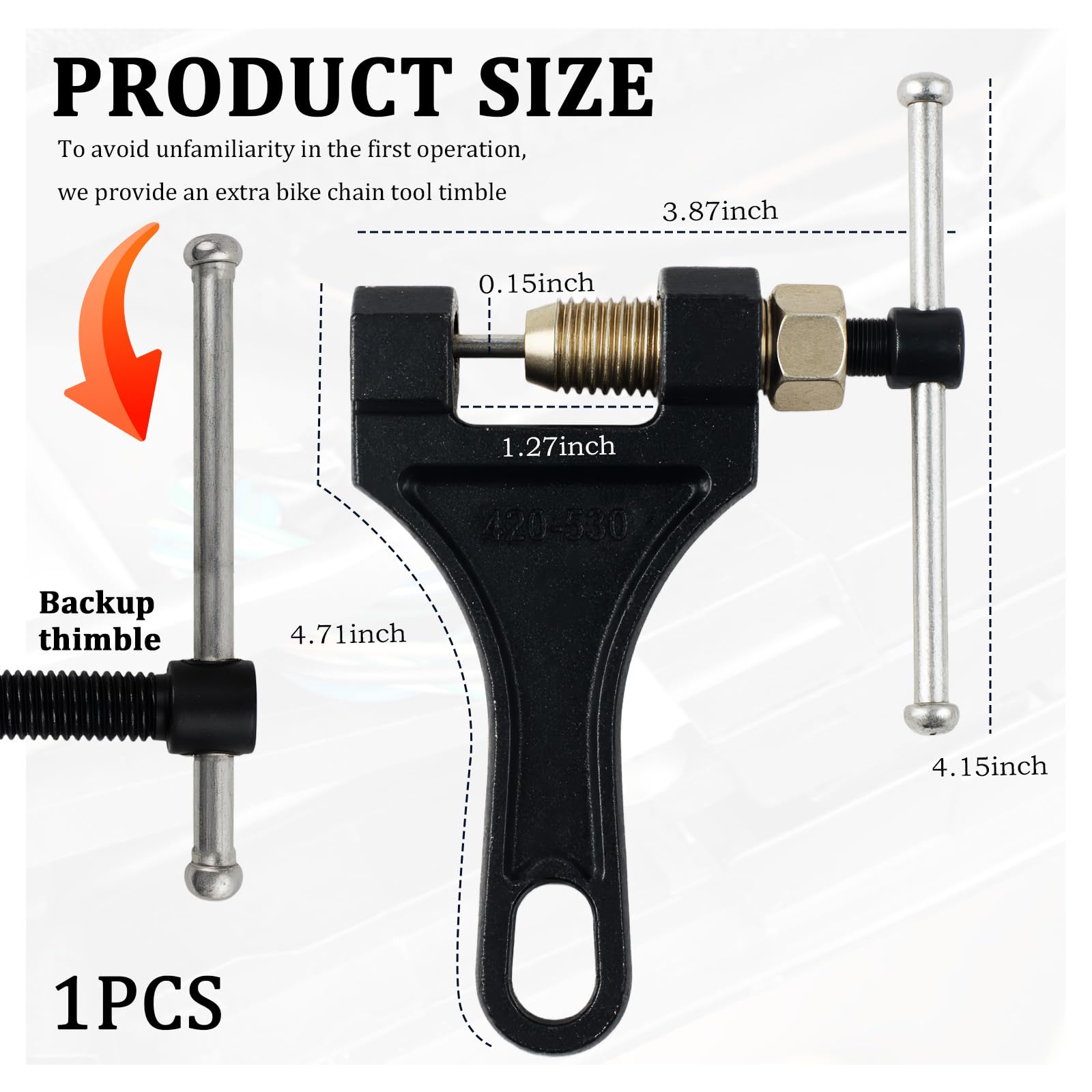 CHAIN BREAKER TOOL DESIGNED FOR FAST, ACCURATE CHAIN BREAKS Product Attributes Colors: Black Sizes: Total Size: 4.71*3.87*0.87 inch Handle Length: 4.71 inch / Internal Spacing: 1.27 inch Thimble Diameter: 0.15 inch Weight: 12.63 oz Material: Iron Packaging: Motorcycle Chain Breaker Tool*1, Replacement Thimble*1 Product Functions & Features 1. Spare Thimble Parts: The thimble is prone to failure after first time handling by newbies or frequent use, so please be careful when using it, and don't worry if it gets broken, a spare thimble has been prepared for you 2. Applicable Chains: You can use it on the following models of motorcycle chains, 530/520/420/525/428 models 3. Reduce Fatigue: The ergonomic grip handle fits the curves of your hand, disperses the pressure when using and reduces the burden on your hand Product Installation 1. Adjust the spacing of the bayonet based on the actual width of your chain 2. Place the chain into the bayonet with the thimble portion aligned with the pin position of the chain 3. Rotate the lever of the thimble until the chain separates