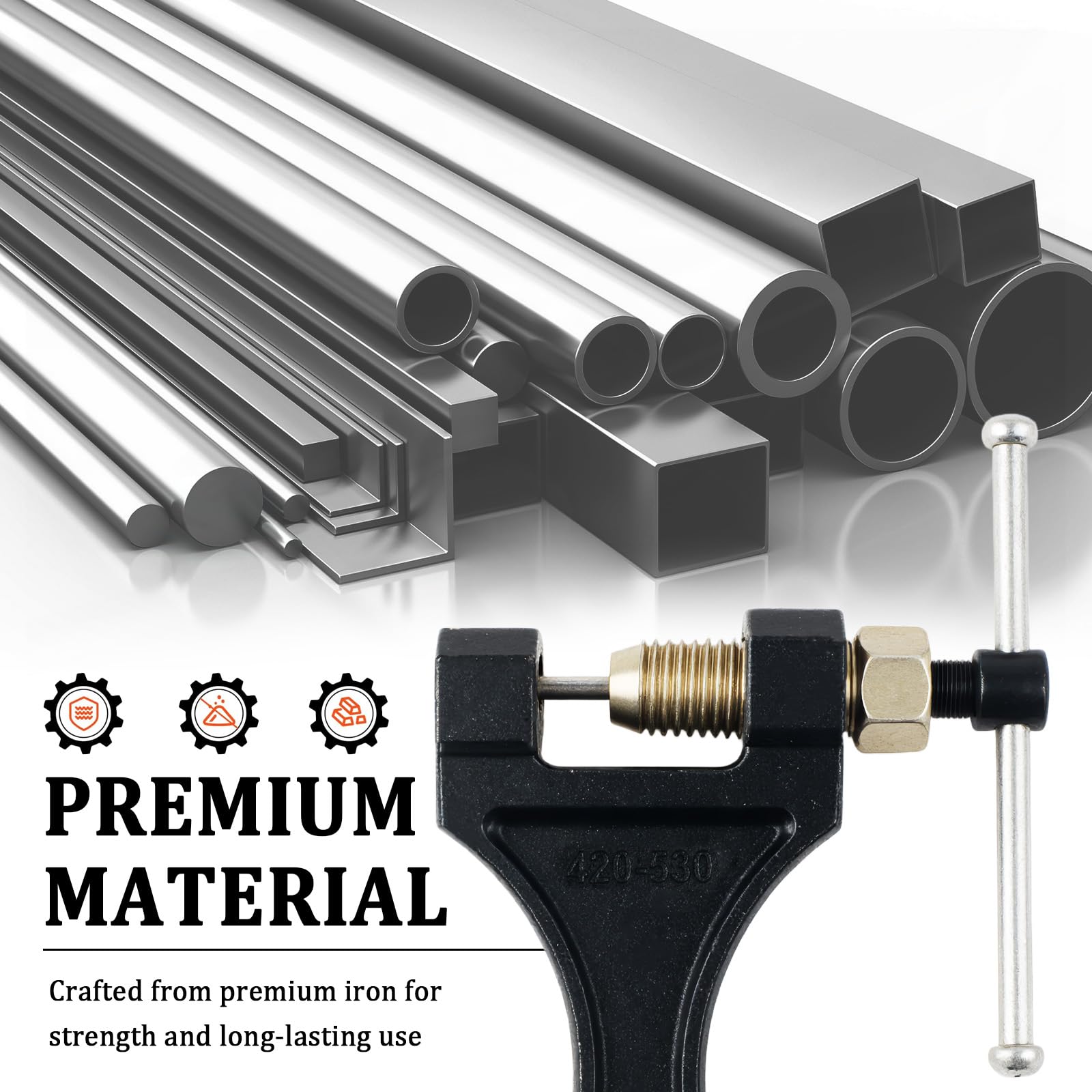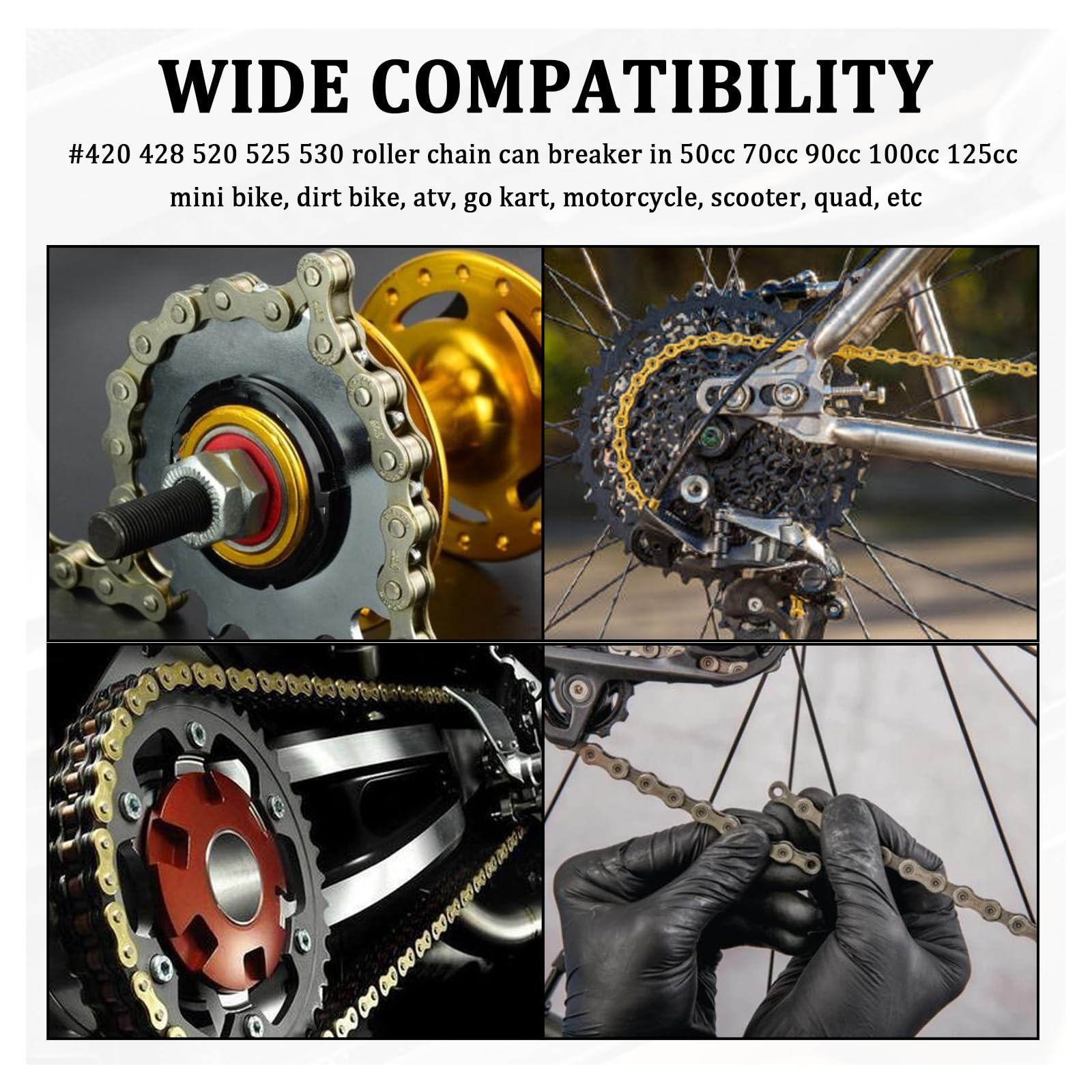 Applicable Chain: You can use our motorcycle chain breaker tool for motorcycle/dirt bike chains that fit 530/520/420/525/428 models, which are common chain specifications in the market. Please read the above information before purchase