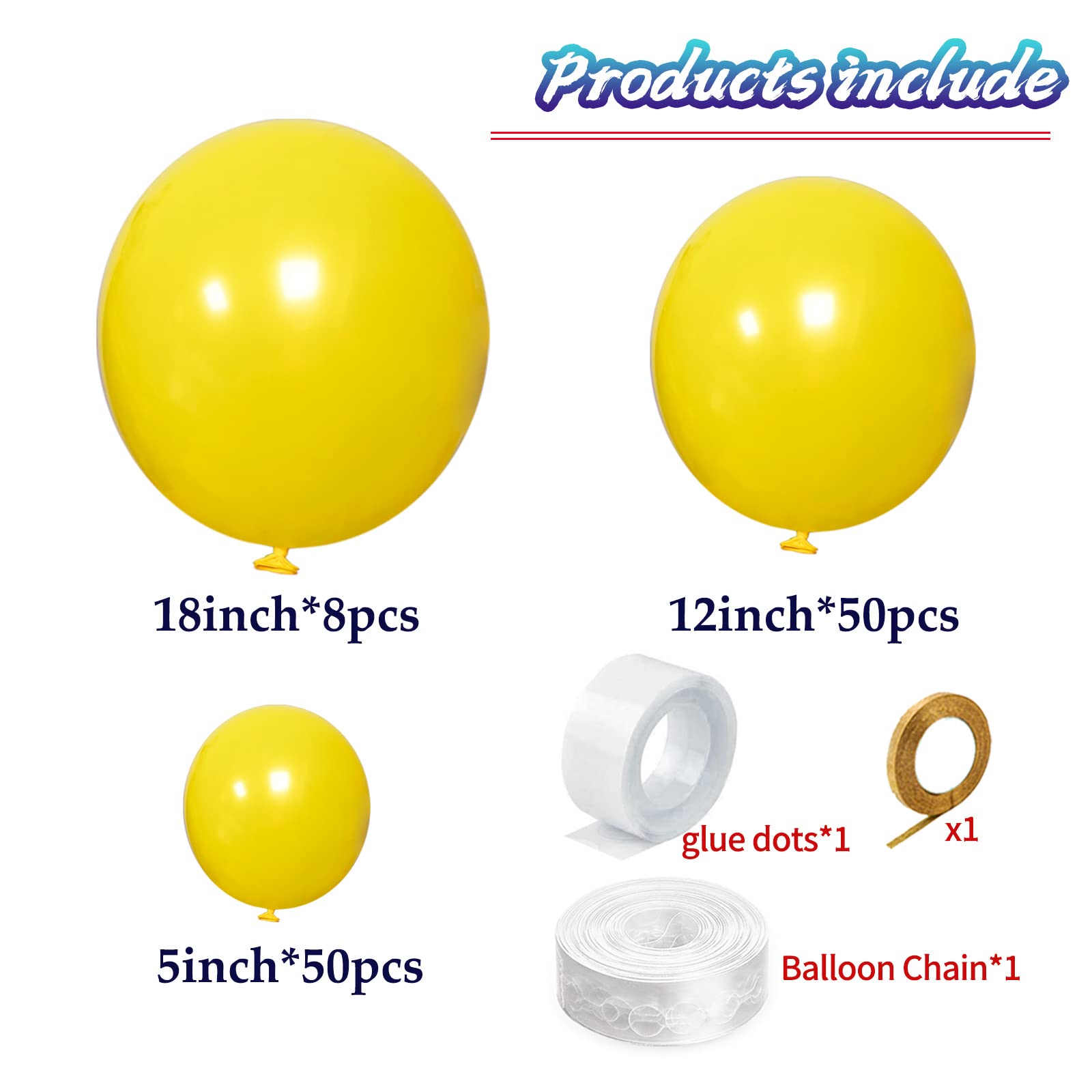 Yellow balloon garland kit: 111Pcs Yellow balloons pack, including 8 pcs 18 inch balloons, 50 pcs 12 inch balloons, 50 pcs 5 inch balloons, a 5 meter balloon chain, 100 dots of glue dots, a roll of ribbon.