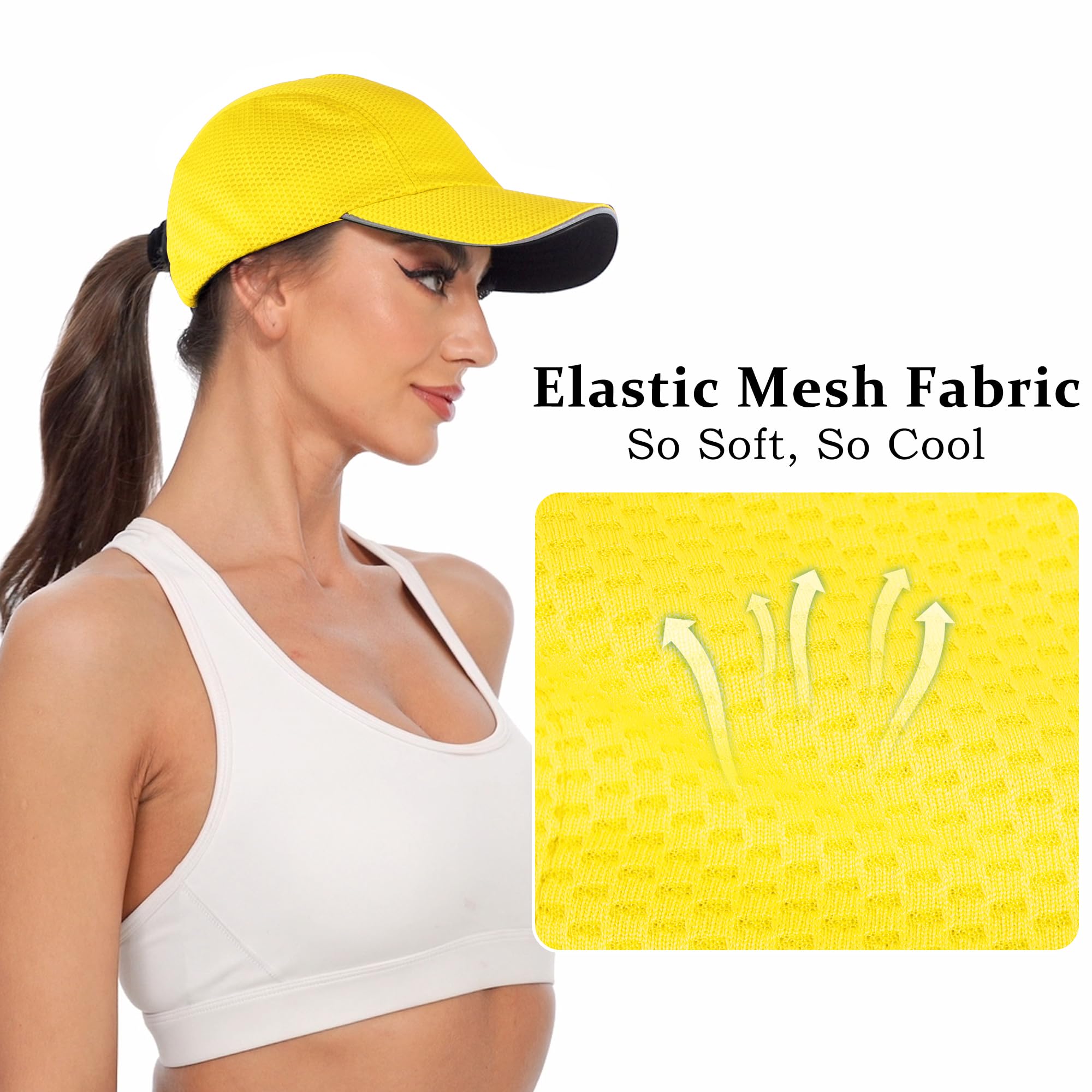 Retroreflective Safety Details: This cool sports cap for women features a stylish reflective ‘sandwich’ trim (also a small reflective details appears on the back) that enhances visibility and safety during those early morning and late afternoon running workouts