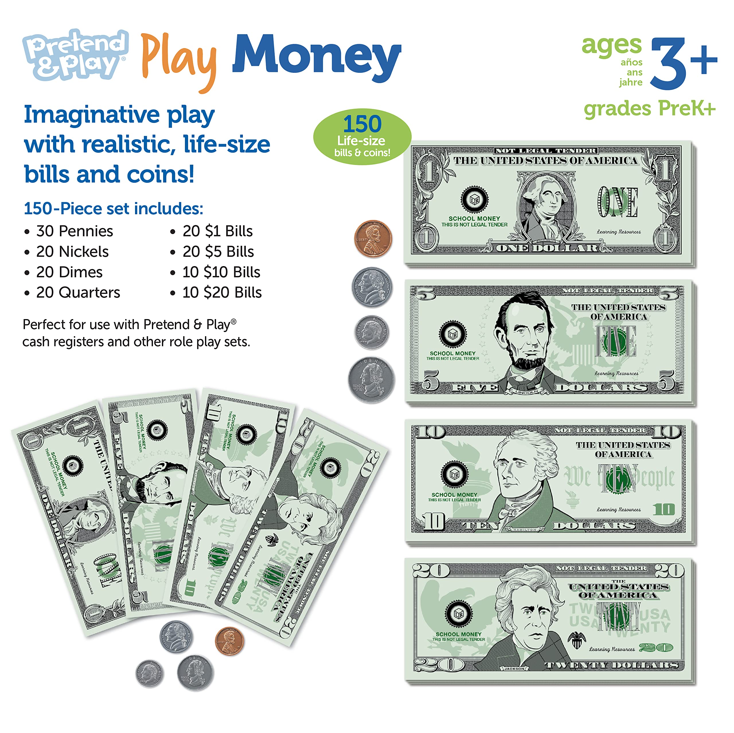 REALISTIC MONEY: Made from heavy-duty paper and printed on both sides, each pretend bill is ready for countless pretend cash transaction