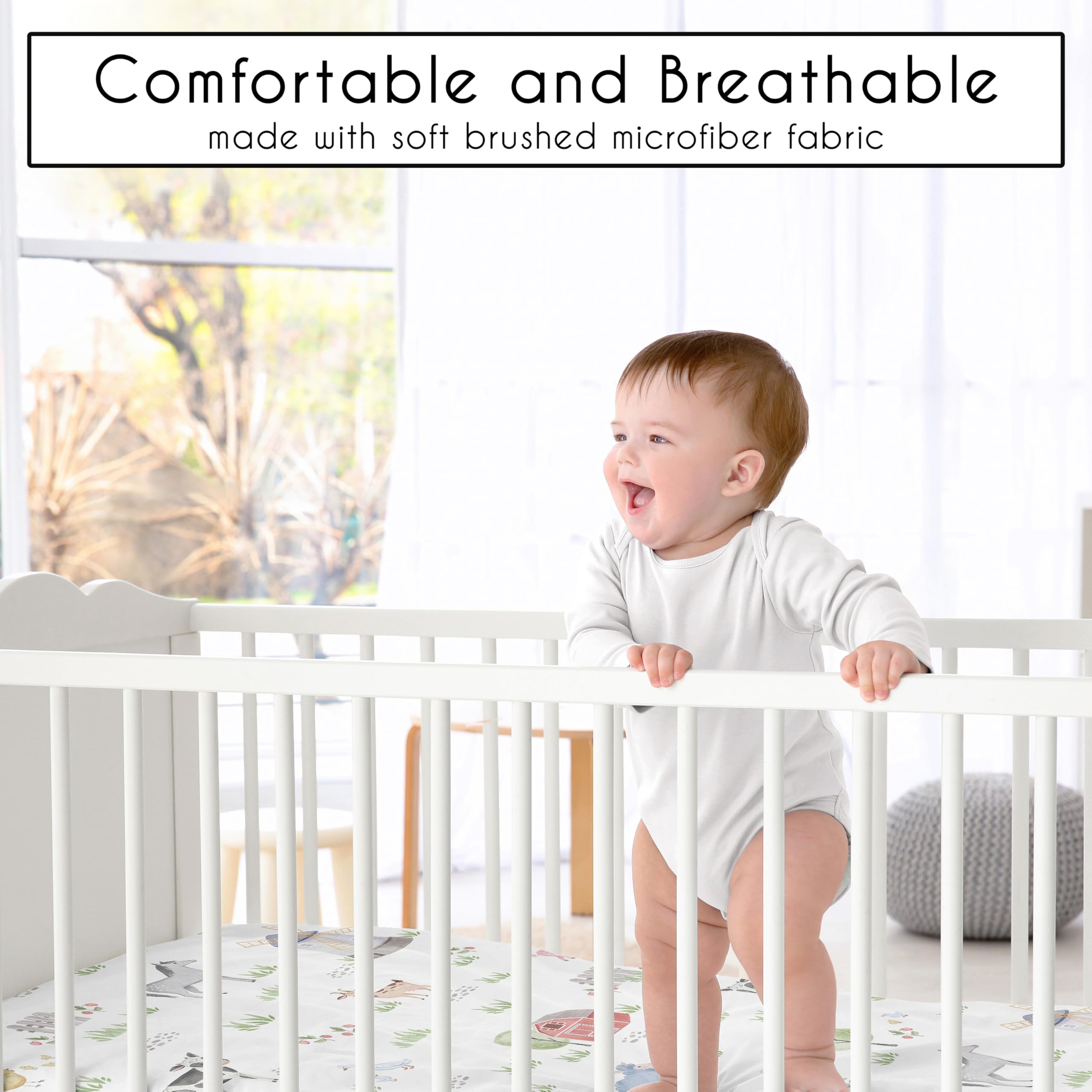 SNUG FIT: Includes (1) Mini Crib Mattress Sheet 24in. x 38in. x 5in. Our newborn mini crib sheets fit snugly, with premium elastic sewn around the entire bottom edge for a secure fit on most smaller size cribs, play yards, & portable cribs to reduce shifting & bunching. This brushed microfiber pack and play sheet features an exclusive design of watercolor farm animals, cows, horses, goose, sheep, pig, rustic barns & windmills print & is gentle on delicate skin. WILL NOT FIT STANDARD SIZE CRIBS.