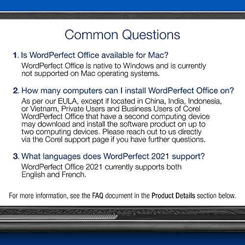 WordPerfect Office Standard 2021 introduces the latest version of the office suite designed to support your everyday work needs—from crafting documents and presentations, to creating impressive spreadsheets! Publish your eBook, edit a PDF, import or export files in 60+ different formats, and more, all with this user-friendly toolkit. Whether you’re new to WordPerfect or you’ve been instrumental in shaping our enhancements through critical feedback, we’ve made it simpler and more intuitive to discover the tools you need to surpass expectations—including your own! All-in-one office suite: WordPerfect - Powerful word processing Quattro Pro - Dynamic spreadsheets Presentations - Captivating slideshow creator WordPerfect Lightning – Convenient note-taking app WordPerfect eBook Publisher – Fast and intuitive publishing Also includes: AfterShot 3 – Photo organizer and editor Minimum System Requirements: Windows 11 or Windows 10* with the latest updates/service packs 1 GHz or faster (x86) or an AMD64 processor 1 GB RAM (x86) or 2 GB RAM (AMD64) 2.75 GB hard disk space for application files 1024 x 768 screen resolution Mouse or tablet DVD drive (Required for box installation) Microsoft Internet Explorer 11 or higher *WordPerfect Office 2021 supports Windows 10 version 20H2 and later versions which may be released during the lifecycle of WordPerfect Office 2021.