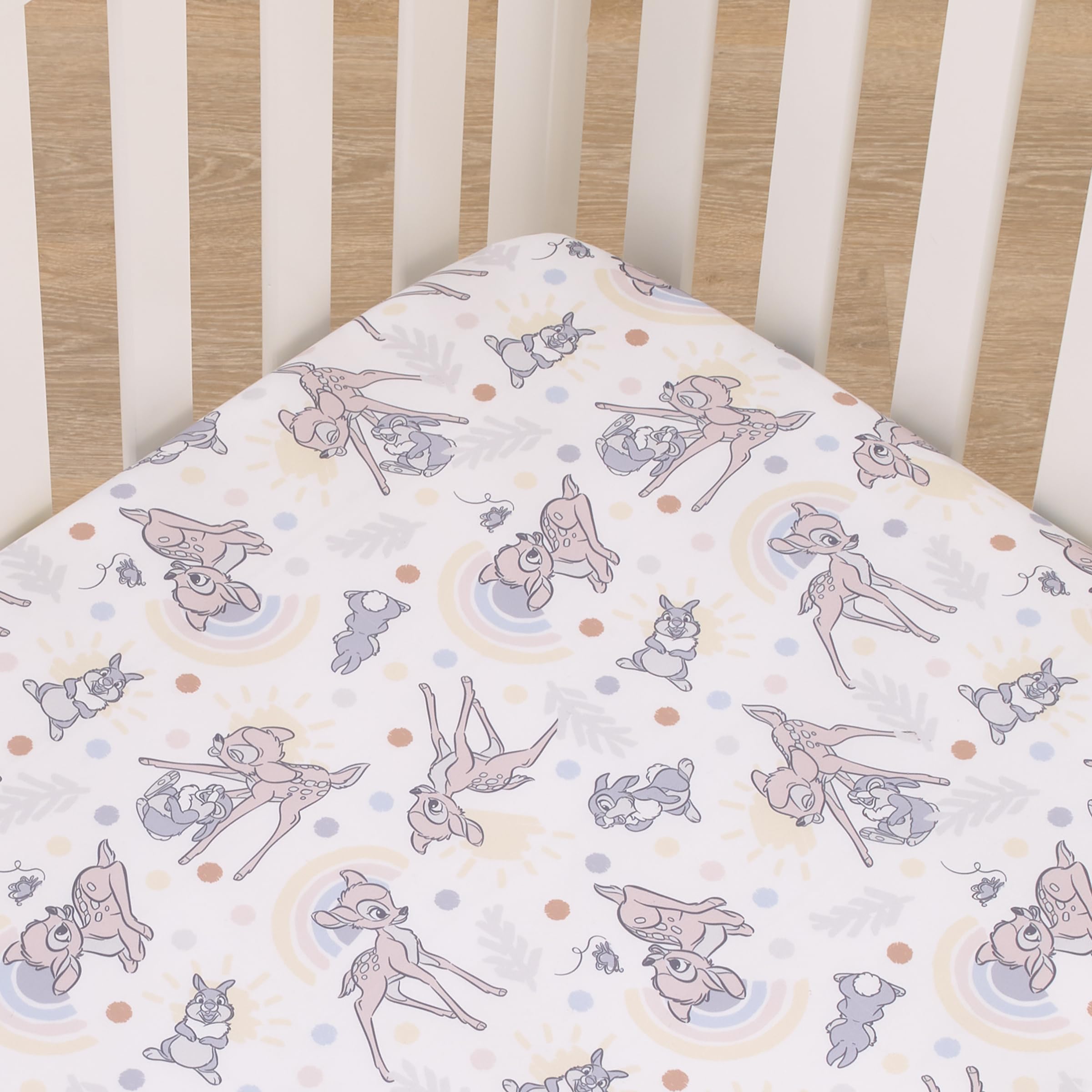 The Disney B is for Bambi Fitted Mini Crib Sheet is designed in a cute allover pattern with Bambi and Thumper playing in the forest leaves under a bright sun, colorful rainbow, and butterflies. Featured in dusty shades of tan, gray, creamy yellow, blue, pink, and white. Measures 24" x 38" x 5" and fits a standard size mini crib mattress. Includes full elastic for a safe and snug fit. Coordinates with the Disney Bambi Infant Bedding!