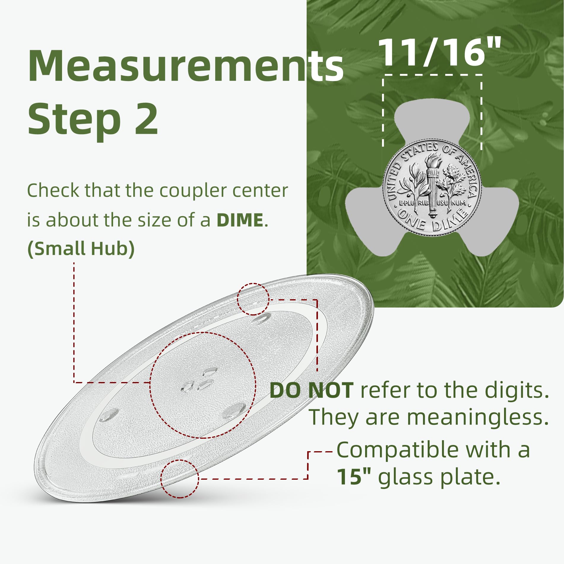 This 15 IN Microwave Glass Turntable has a one-dime sized small coupler hole in the center. (The center spot of turntable coupler measures 11/16" in diameter)