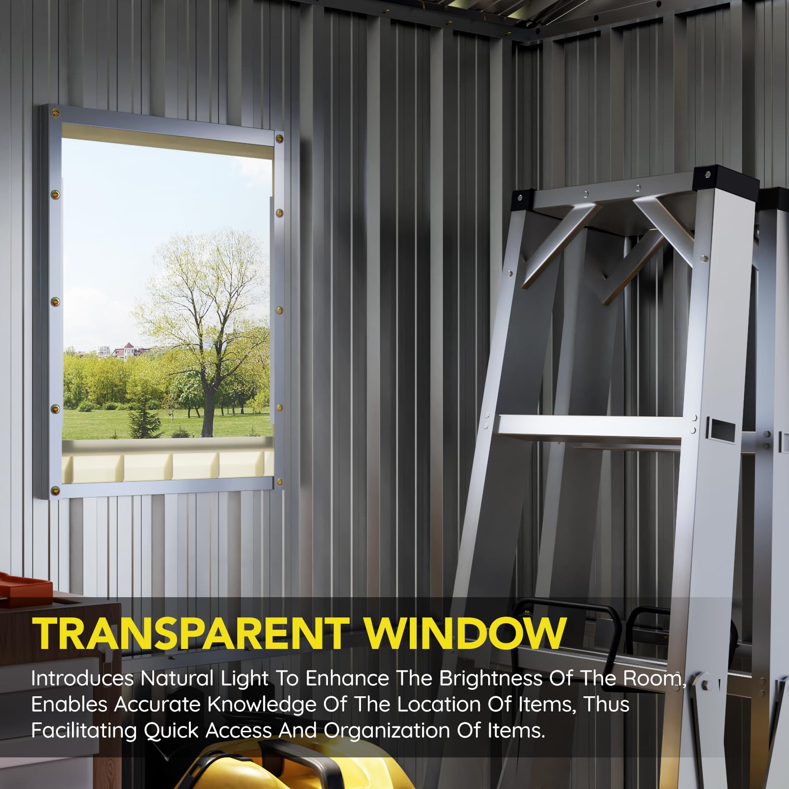 Spacious & Functional Design: This 10x12 FT metal storage shed features double swing doors for easy access, two clear windows for natural light, and a replaceable skylight roof panel to brighten your workspace. Durable & Weather-Resistant: Built with galvanized steel panels, this shed resists rust, corrosion, and harsh weather conditions, ensuring year-round protection for your belongings. Floor Frame Option Available: Choose between versions with or without a floor frame to suit your installation needs, whether placing it on concrete, gravel, or grass. Versatile Storage Solution: Perfect for storing bikes, lawn tools, gardening equipment, seasonal décor, and more. Keep your patio, garden, or backyard organized and clutter-free. Secure & Easy Assembly: Includes lockable doors for added security and step-by-step instructions for a straightforward assembly process.