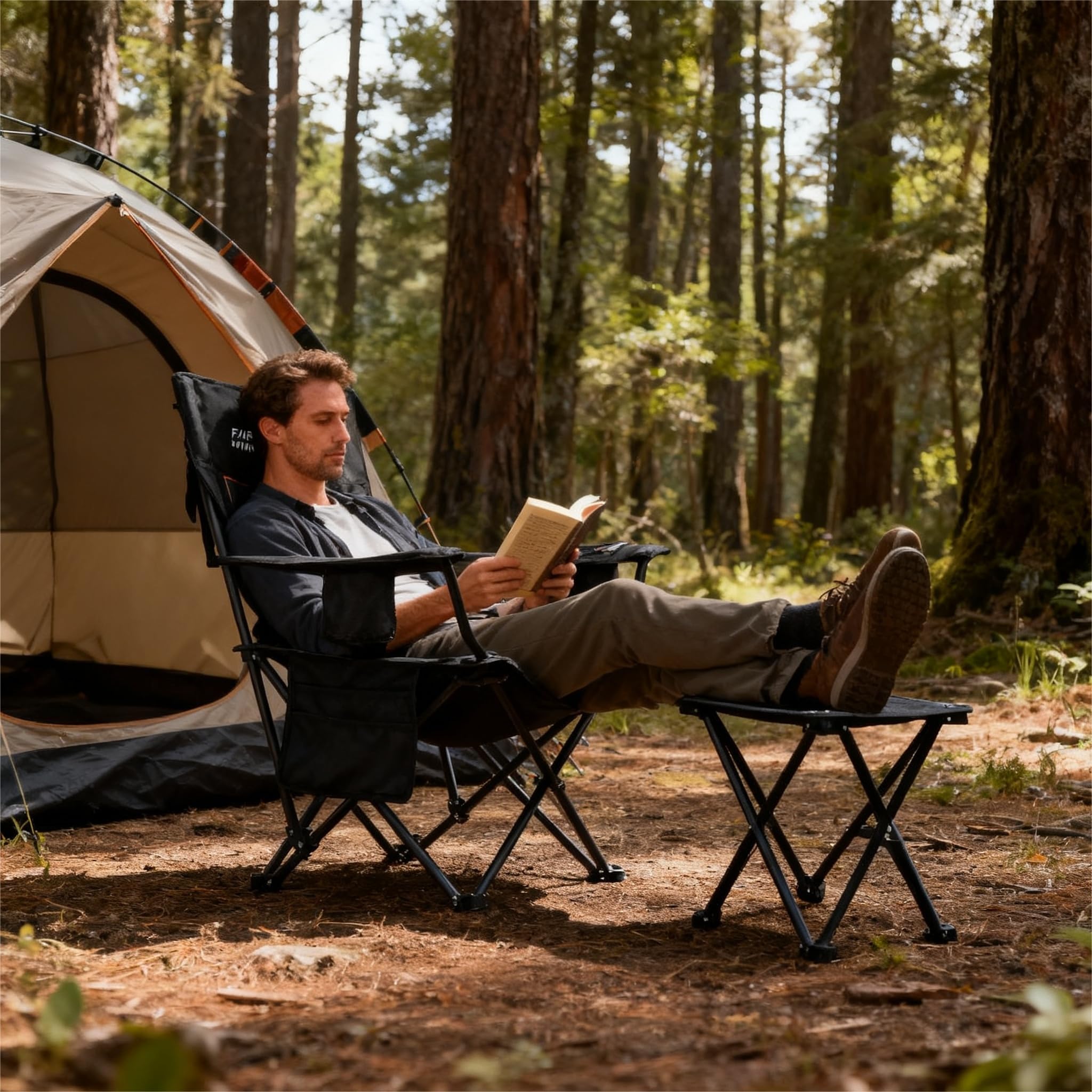 【Heavy Duty Lounge Chair Set】: Strength high tensile steel frame. Camping chair attached an ottoman, footrest (which can be used as a side table).