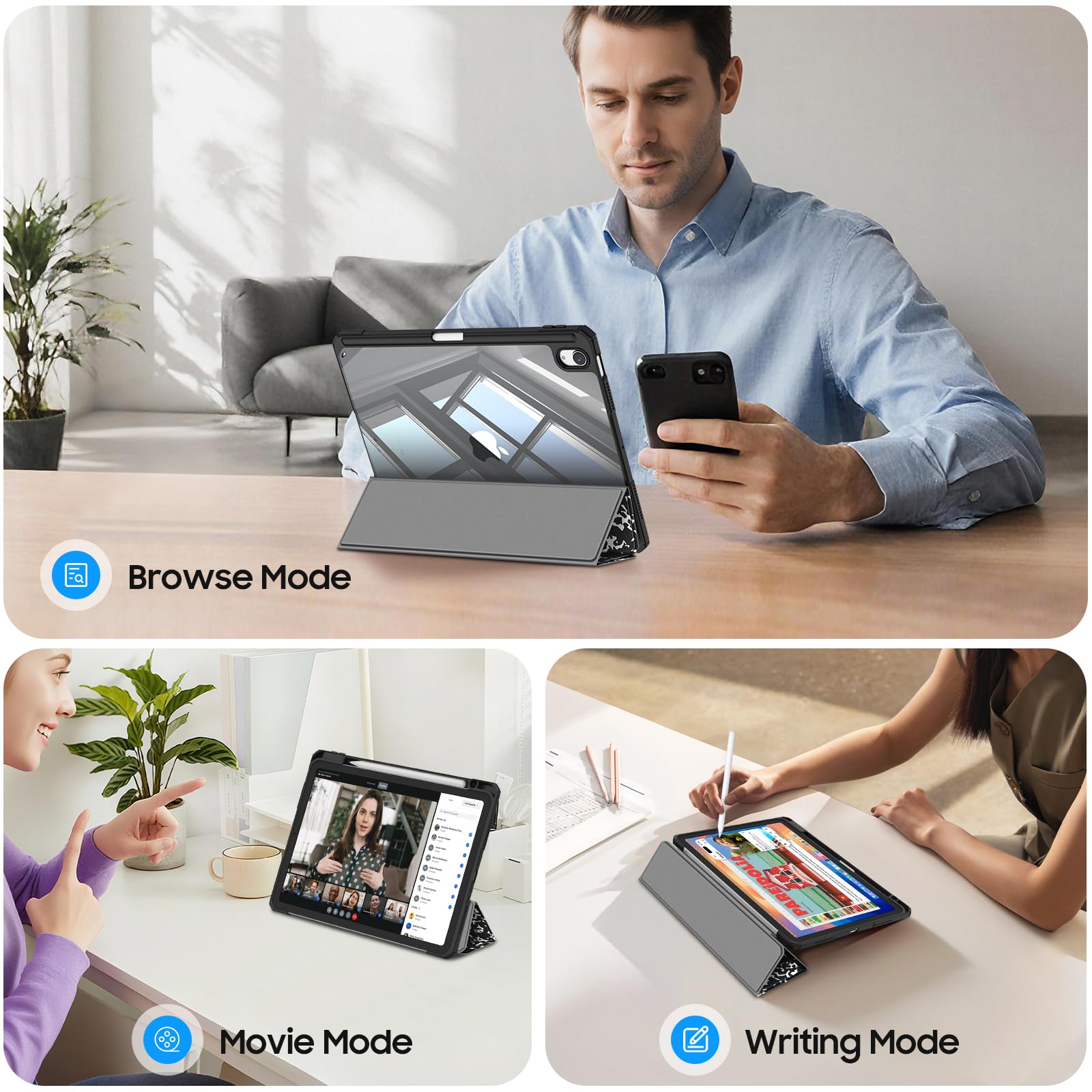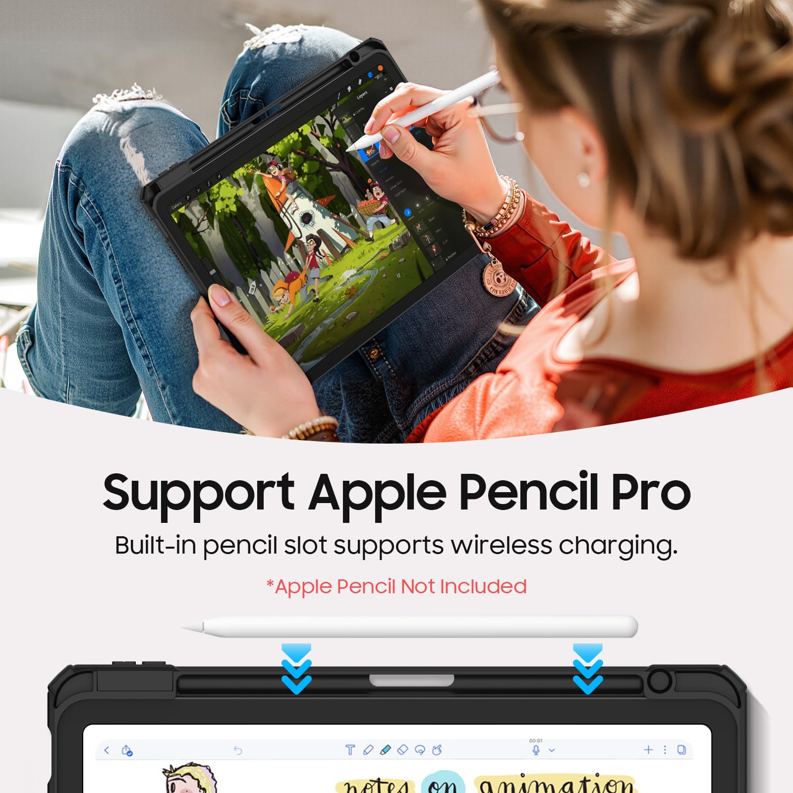 Seamlessly supports Apple Pencil Pro / Apple Pencil 2nd Gen magnetic and wireless charging when case is on. Tri-fold front cover has flip capability to transform the iPad case into a viewing stand and keyboard stand.