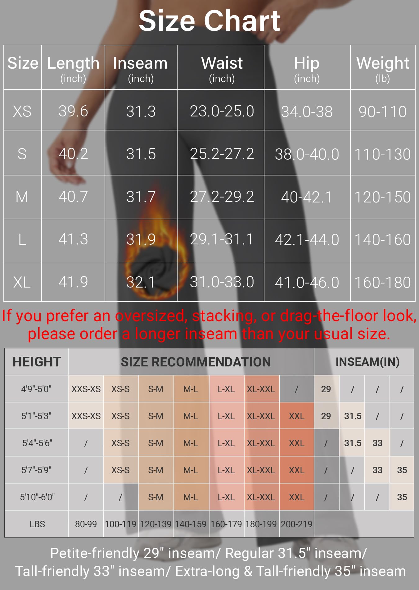 Womens Workout Leggings: For an oversized, stacking, or drag-the-floor look, please order a LONGER inseam than your usual size