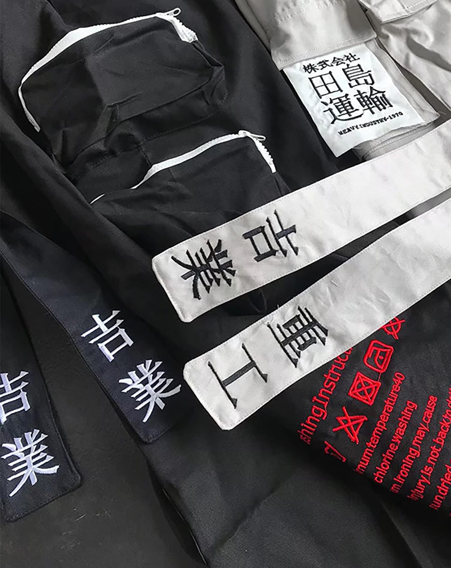 Removable samurai dropdown back tabs with Japanese kanji design translating to "Heavy Urban Industries"