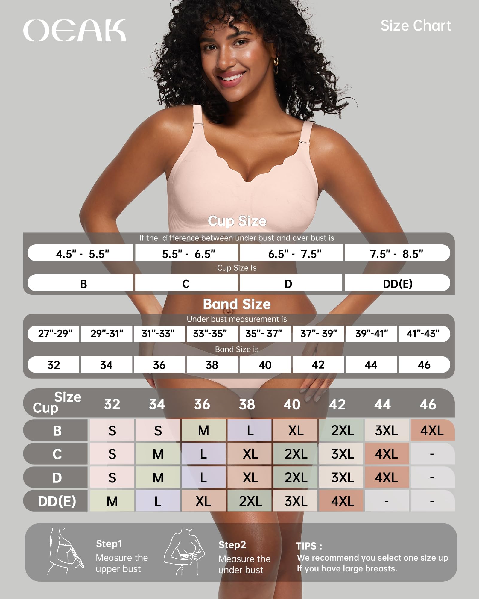 Lightweight Wirelss Bra - 65% nylon and 35% spandex. This bras are crafted from upgraded fabric for an ultra-soft touch, enhanced stretchability, and greater size inclusivity,And the added jacquard pattern on the exterior makes this scalloped bra more sophisticated.This bra is highly elastic, comfortable, smooth, and breathable, ensuring unparalleled comfort without any pressure. It's perfect for daily wear, providing a "no feeling" sensation.