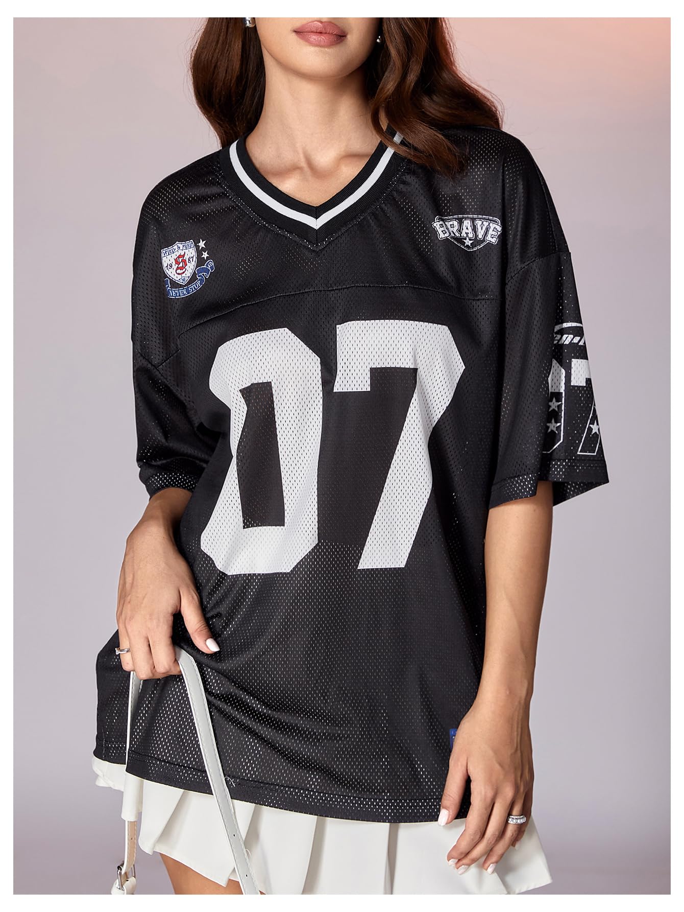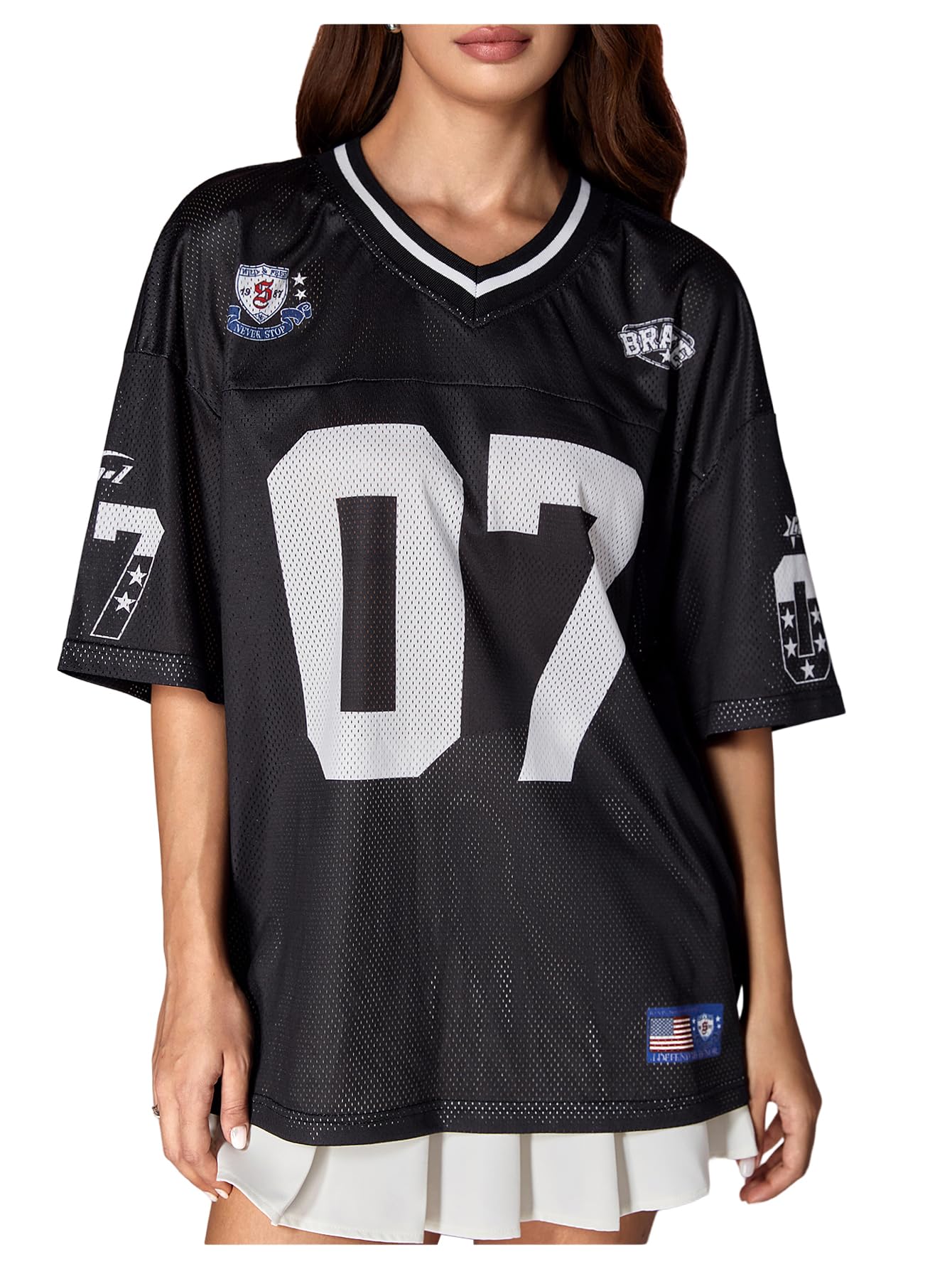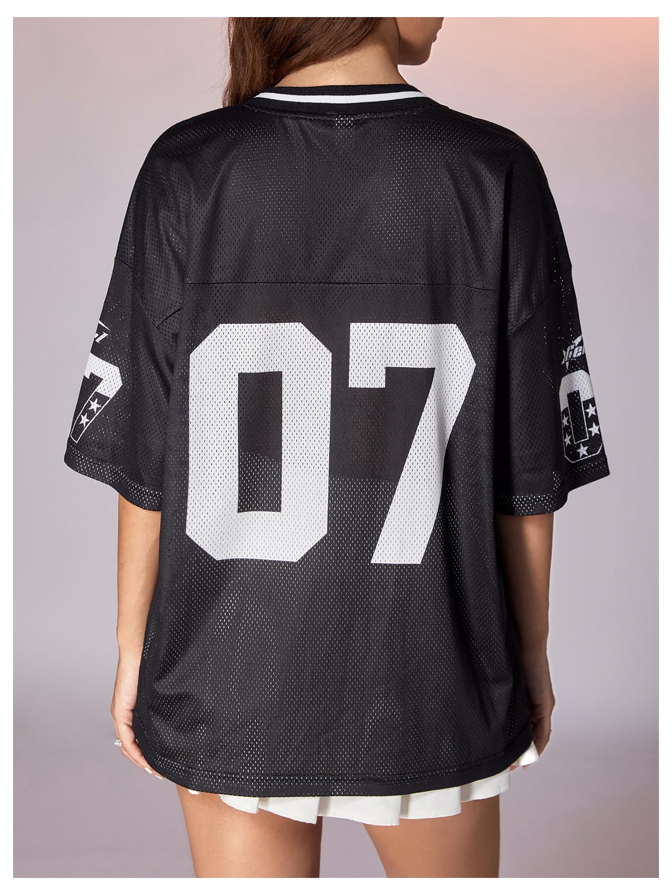 Features: trendy y2k jersey shirts, cute football jerseys, y2k graphic tee, oversized tee tops for women, going out tops for women, vintage t shirts, letter print, striped, mesh, v neck, half sleeve, drop shoulder, loose fit, fashionable