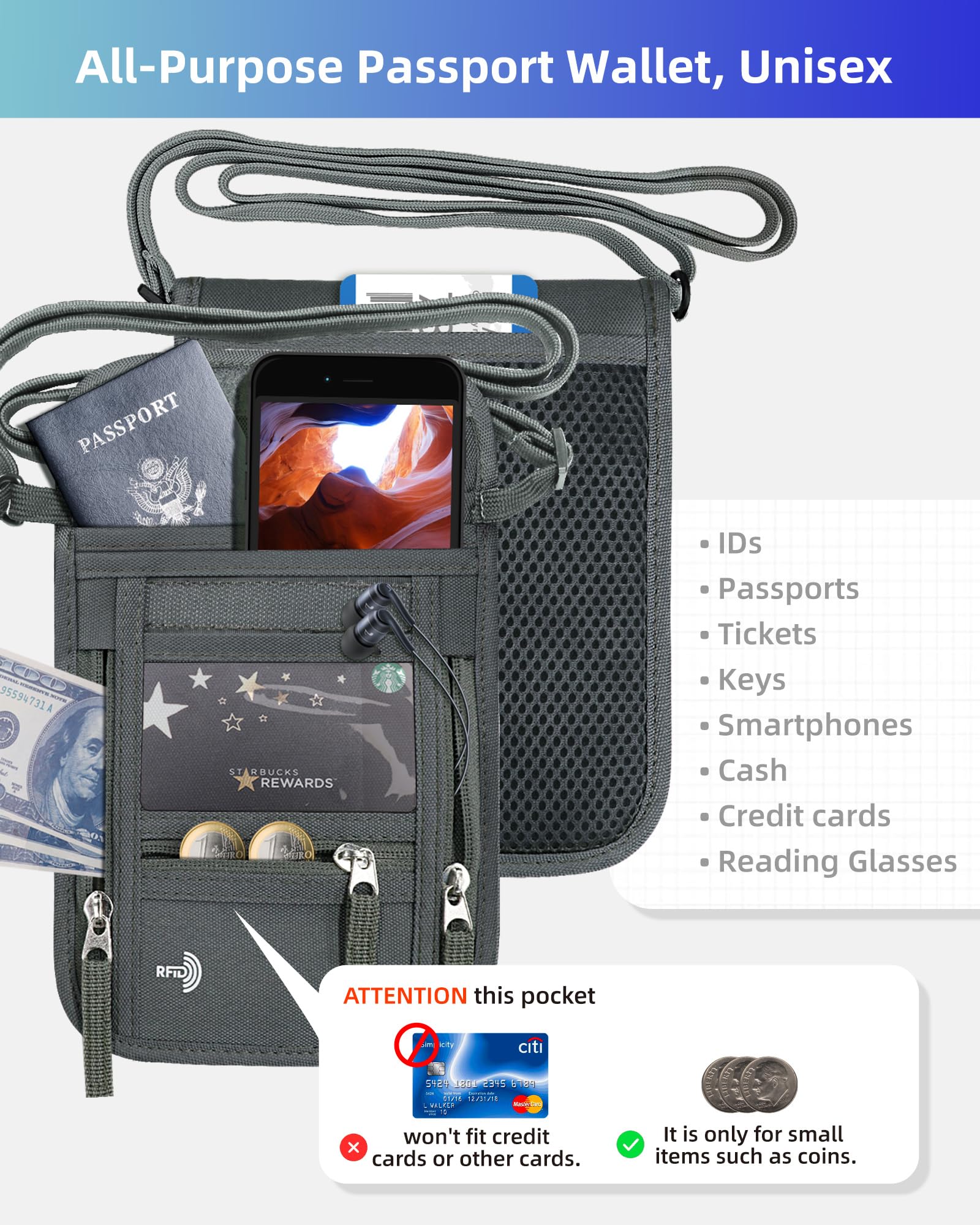 SUITABLE FOR MEN AND WOMEN: 7.5”high and 6”wide, the soft and adjustable neck strap can be adjusted from 14.5 inches to 28 inches depends on your needs. You can carry this under a jumper or a jacket, which makes it super safe against pick-pockets. You can also put it on like a cross shoulder bag