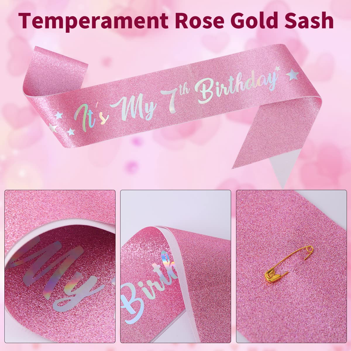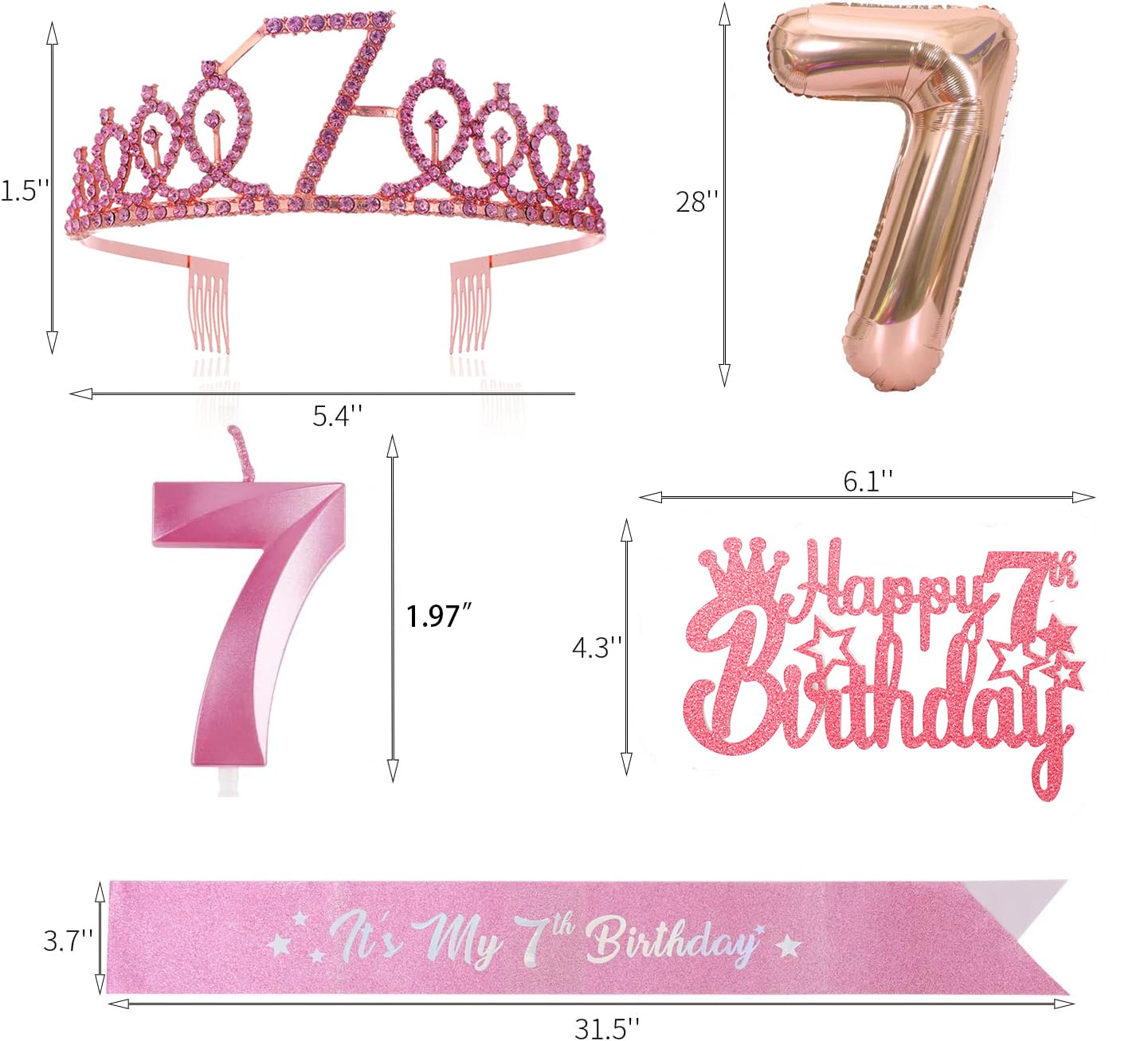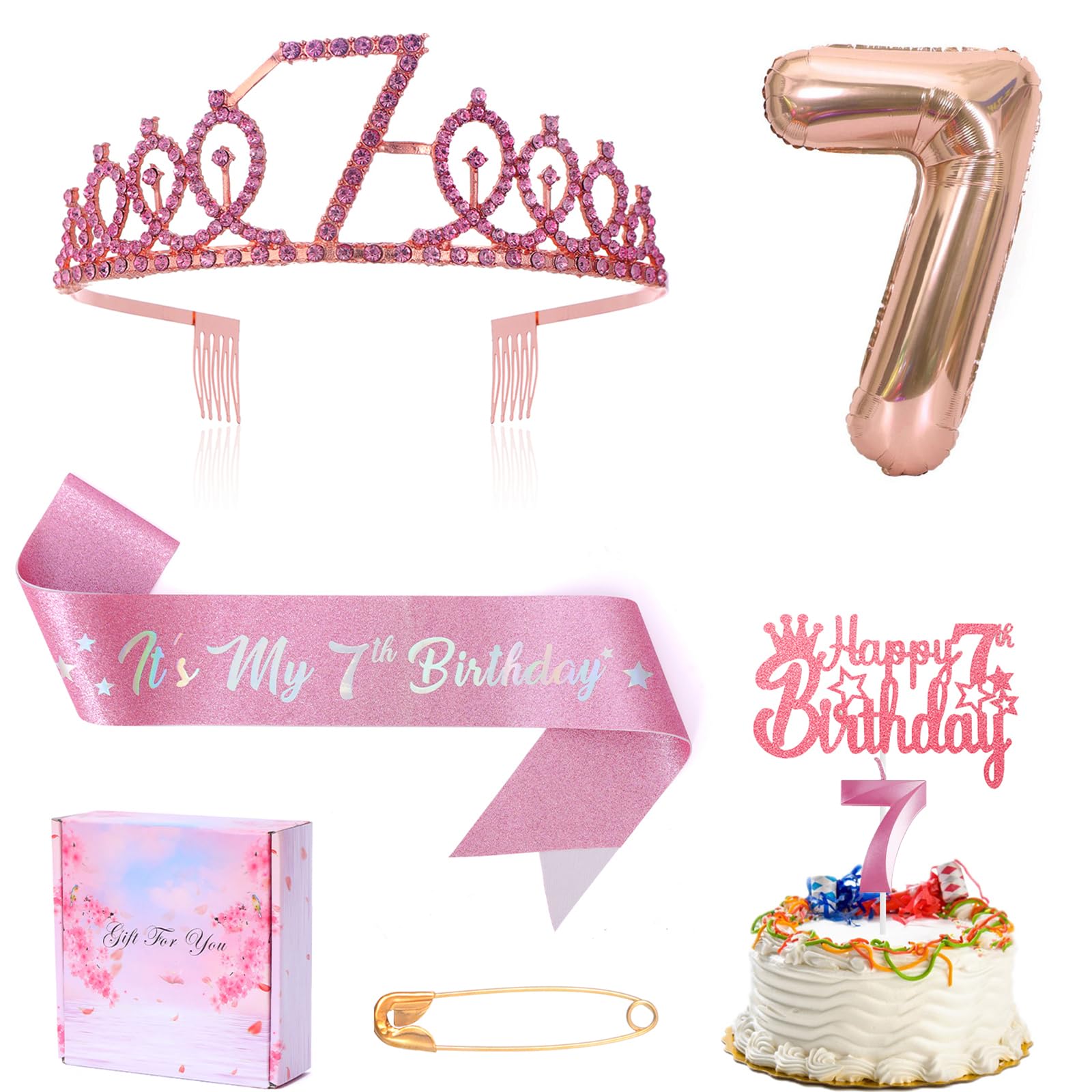 【Package Include】Pink 7 Birthday Candle,Rose Gold 7 Birthday Sash, 7 Birthday Crown/Tiara, Happy 7th Birthday Cake Topper, 32inch Number 7 digital come with a pink gift box;All you needs for a girl's 7th birthday party decor are have;