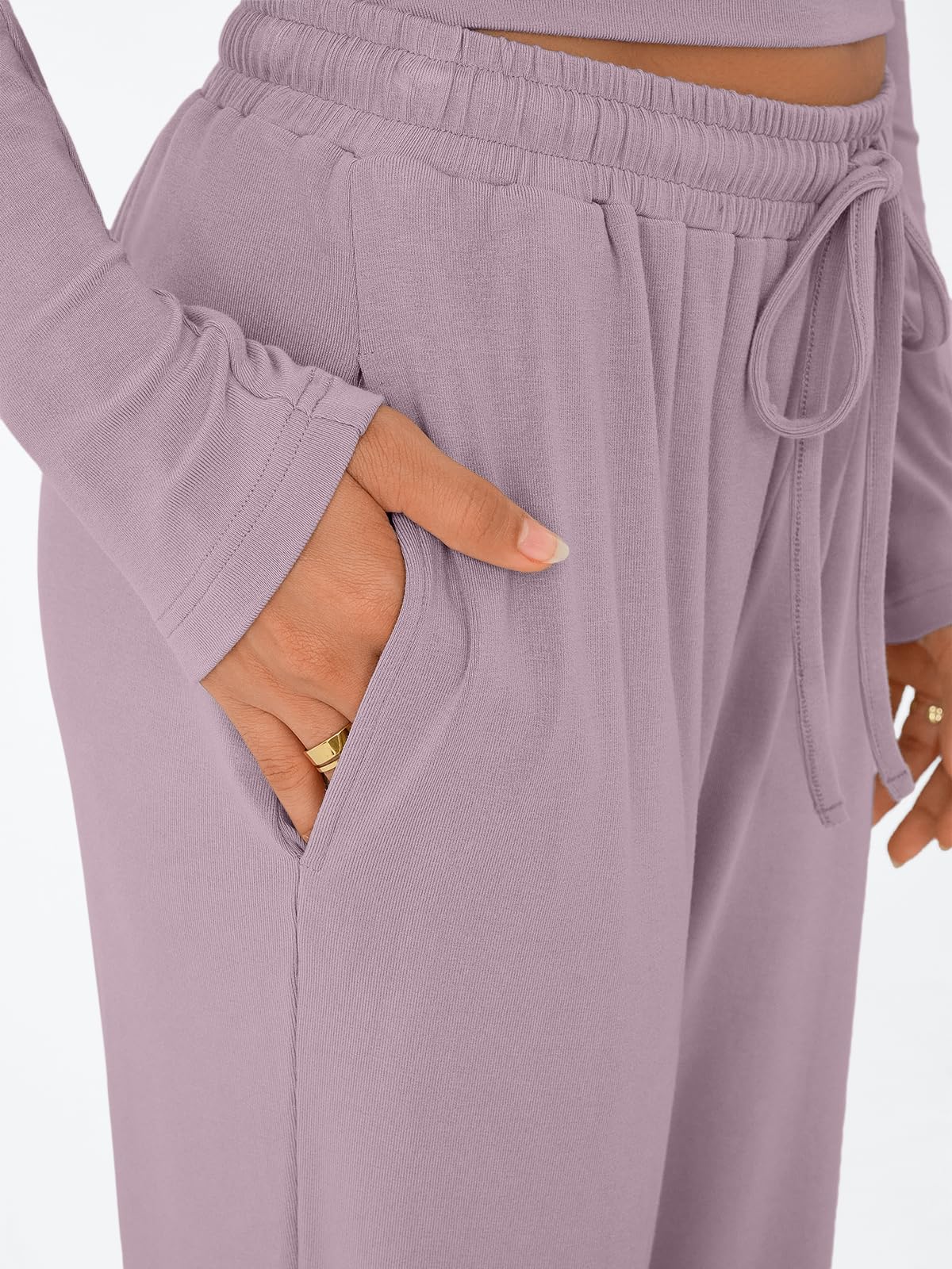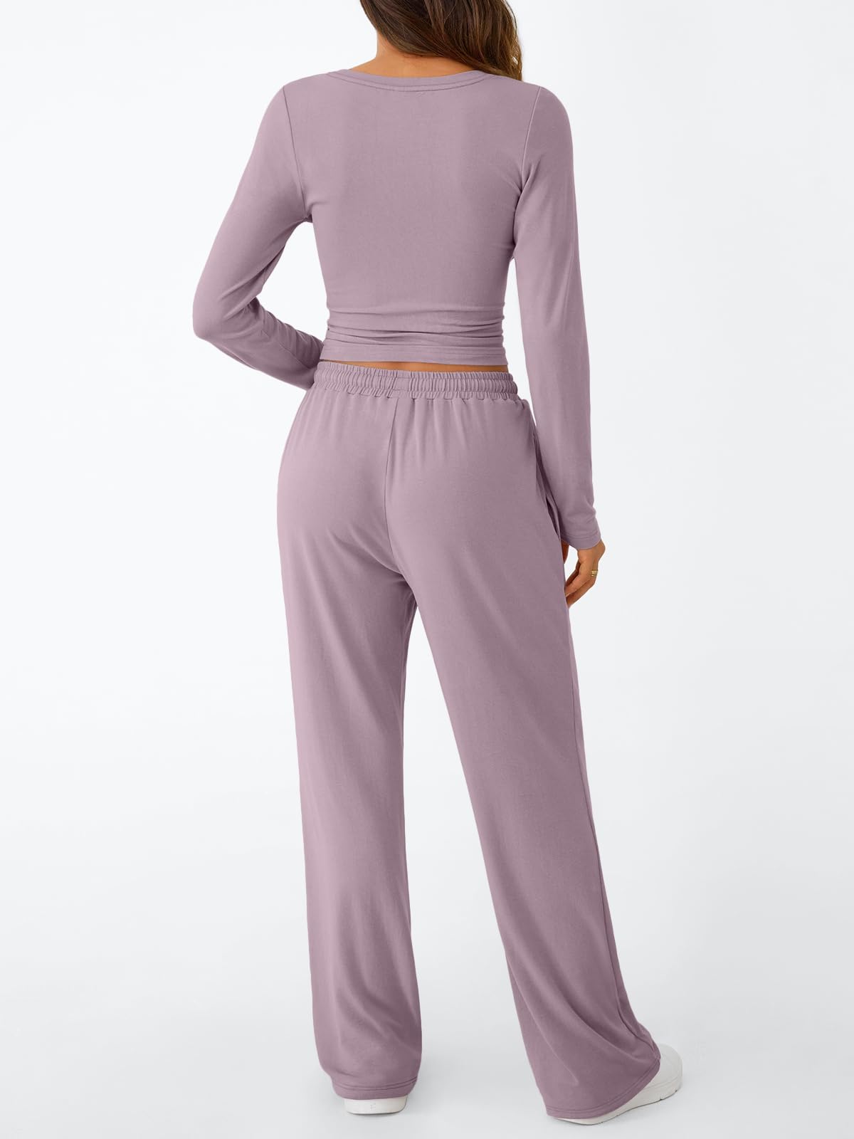 Design & Style: With a sleek crop top and wide-leg pants, this set is designed for those who love a mix of style and relaxation. The side ruching adds a touch of elegance, while the drawstring waist on the pants guarantees a comfortable fit that moves with you.