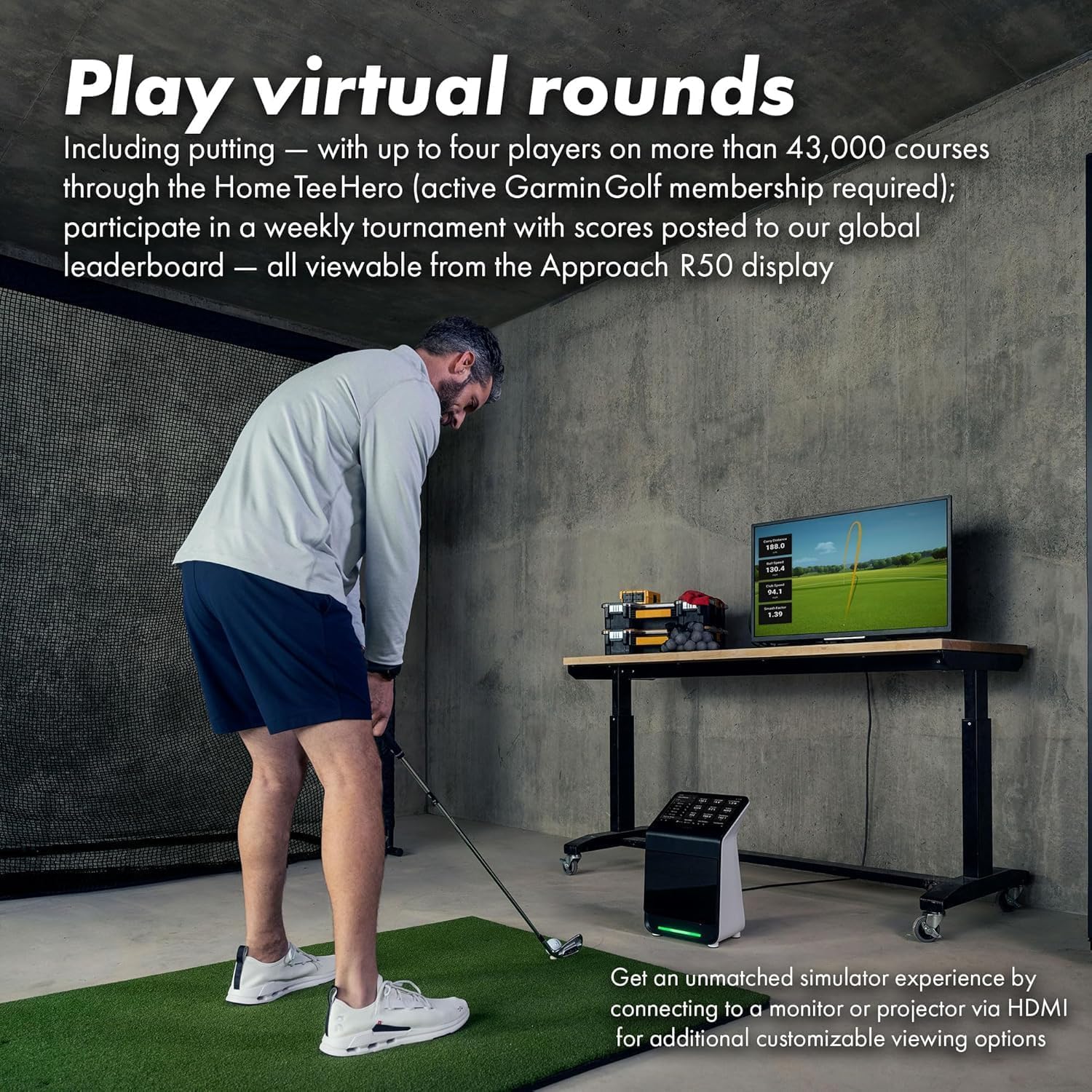 Play Year-Round' The Garmin Approach R50 Premium Golf Launch Monitor and Simulator lets you play on 43,000+ virtual courses from home or the range.