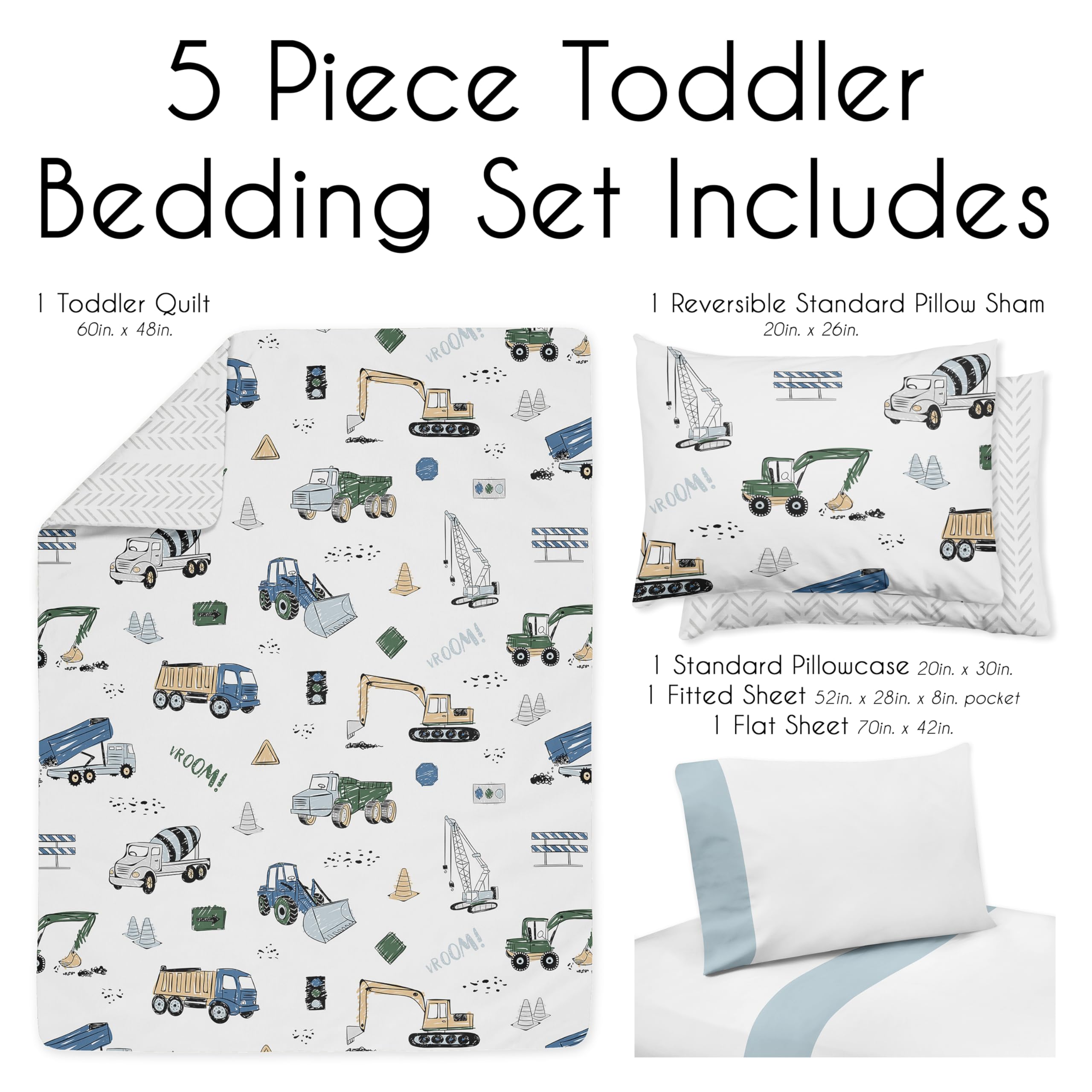 5 Piece Set Includes: (1)Toddler Comforter, (1)Sham, (1)Pillow Case, (1)Flat Sheet, (1)Fitted Sheet