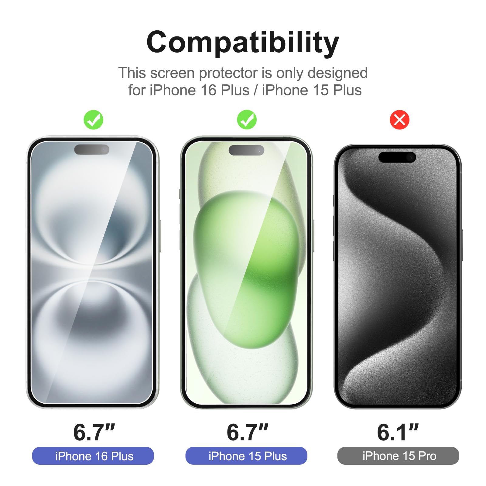 Content: 3 Tempered Glass Screen Protectors for iPhone 16 Plus,15 Plus (6.7 inches) and an easy installation tool. 9H hardness, scratch resistance. Enhanced touch response and super transparency.