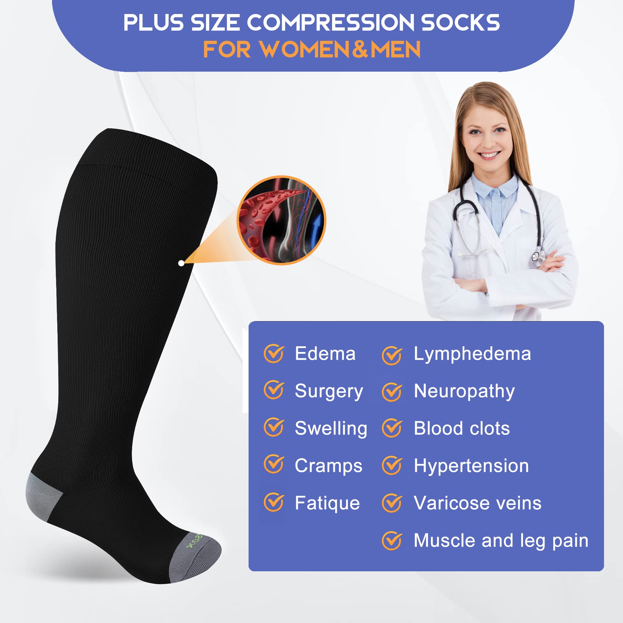 Plus Size Compression Socks Wide Calf: These wide calf compression socks are designed for people with wider calves, providing excellent leg support and long-lasting graduated compression. They are easy to put on and take off and won't roll down or cut into your leg due to their 360° stretchy and wide cuff. They are also durable and comfortable to wear.