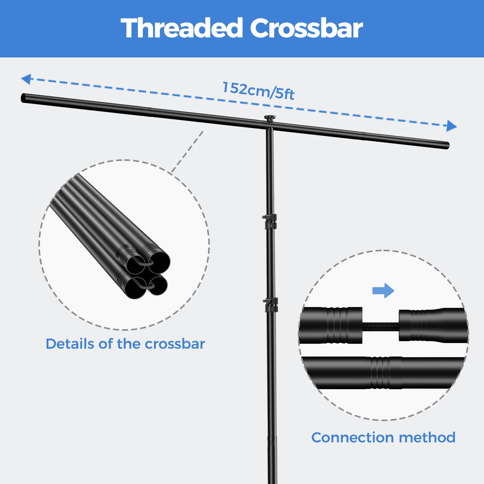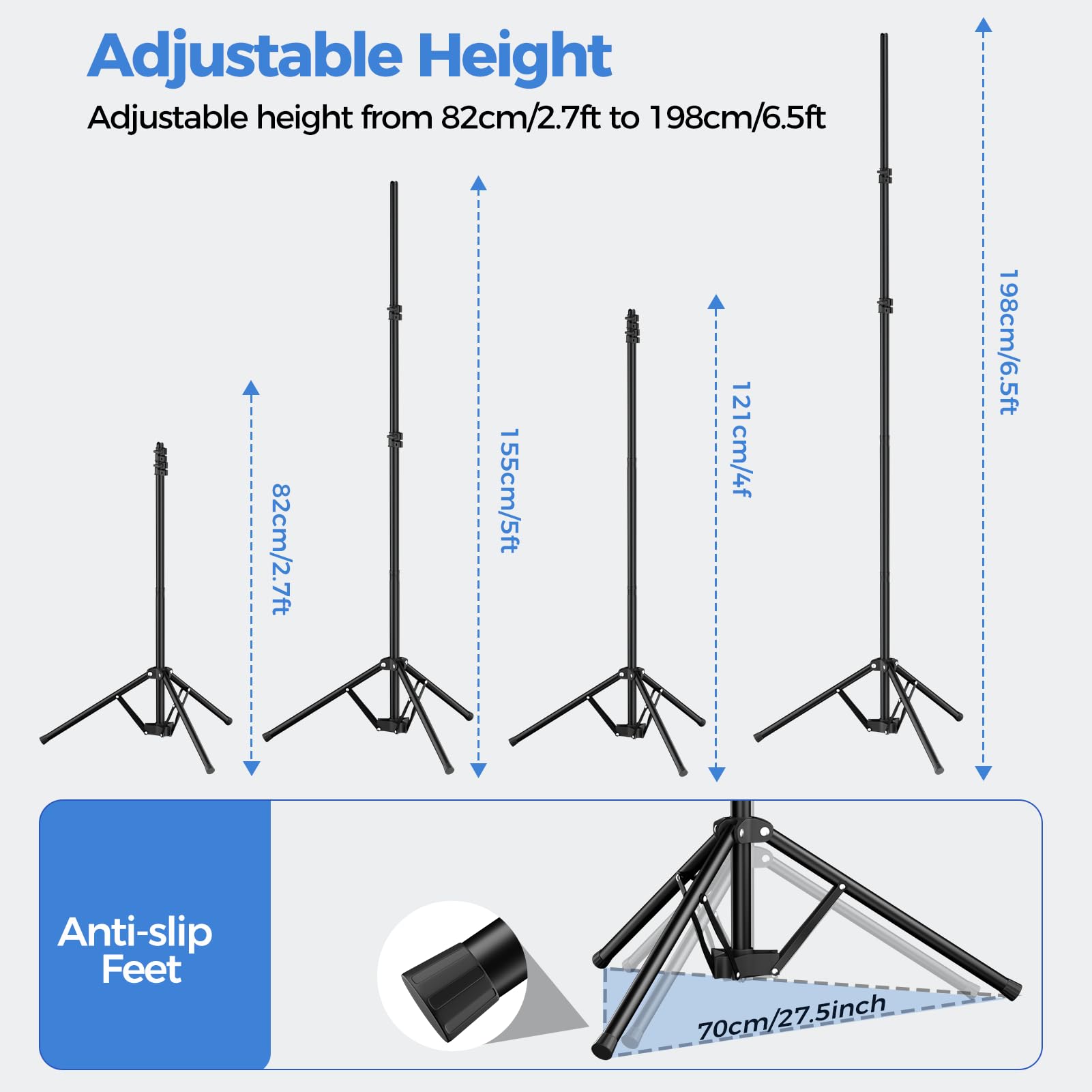 [Adjustable T-shaped Stand]The height of the stand can extend from 120 cm to 198 cm (4 ft to 6.5 ft).After removing the telescopic rod, it can be adjusted from 82 cm to 152 cm (2.7 ft to 5 ft), with a width of 5 feet, making it suitable for use in both desktop and floor scenarios