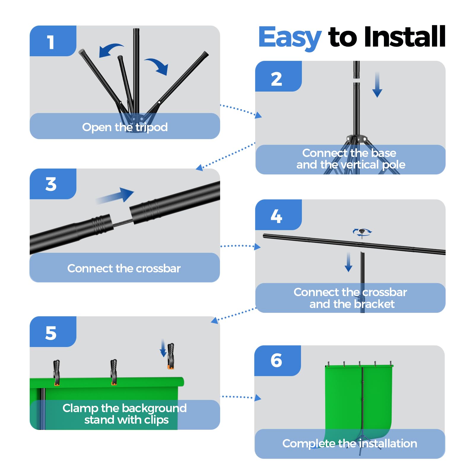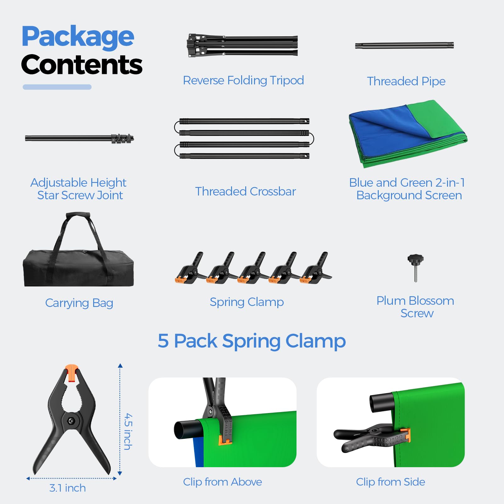 [Portable & Set-up Fast] The 2-in-1Blue Green Screen adjustable background stand is convenient to assemble and disassemble.With a carrying bag, both the backdrop stand, 5 clamps and the green blue backdrop can be stored, easy to store or carry