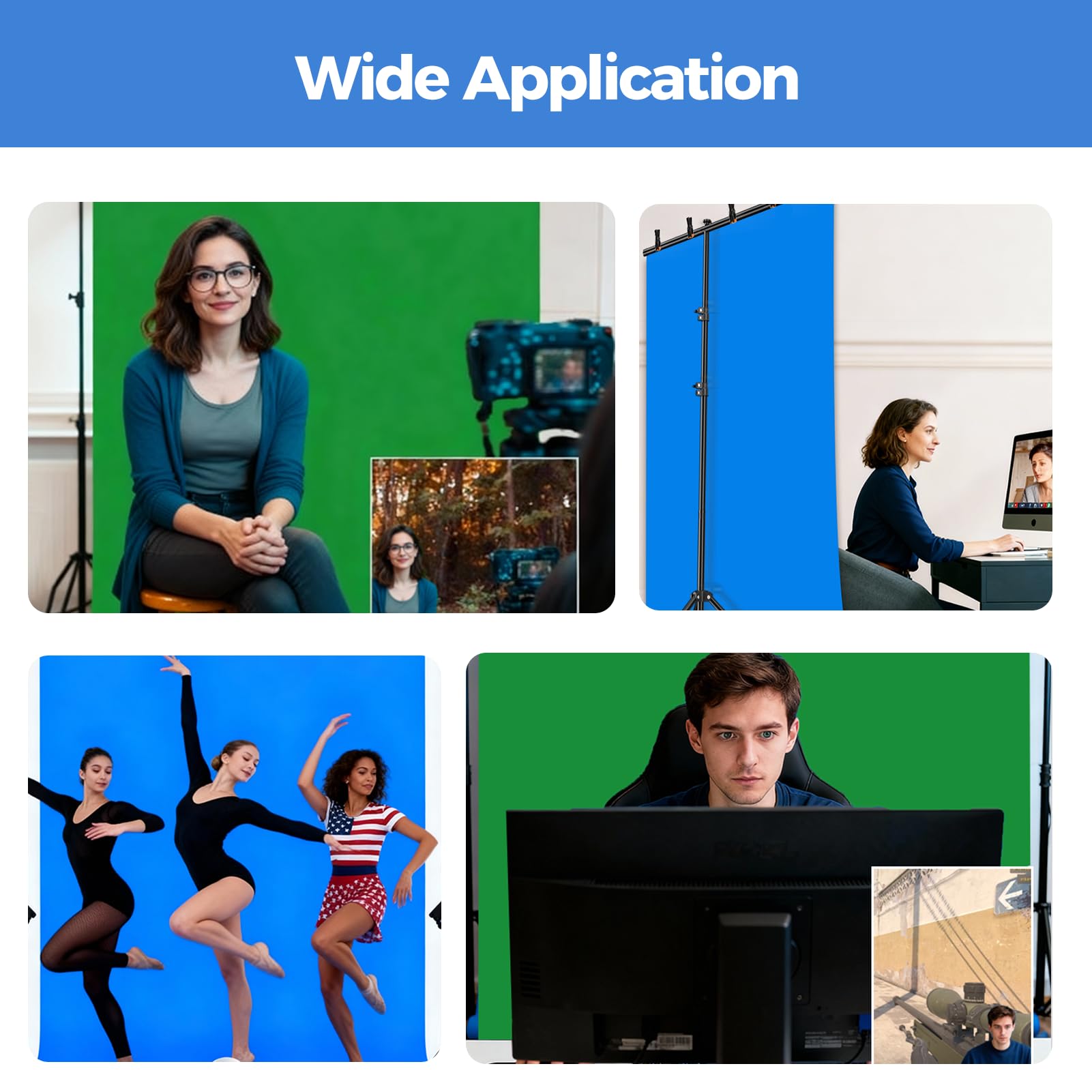 [Application]The chromakey blue green screen backdrop stand kit enables quick and clean chroma key compositing in videos and images, ideal for home office, vlogging, TV broadcast, gaming, VR, zoom, live streaming, YouTube video recording, webcam etc