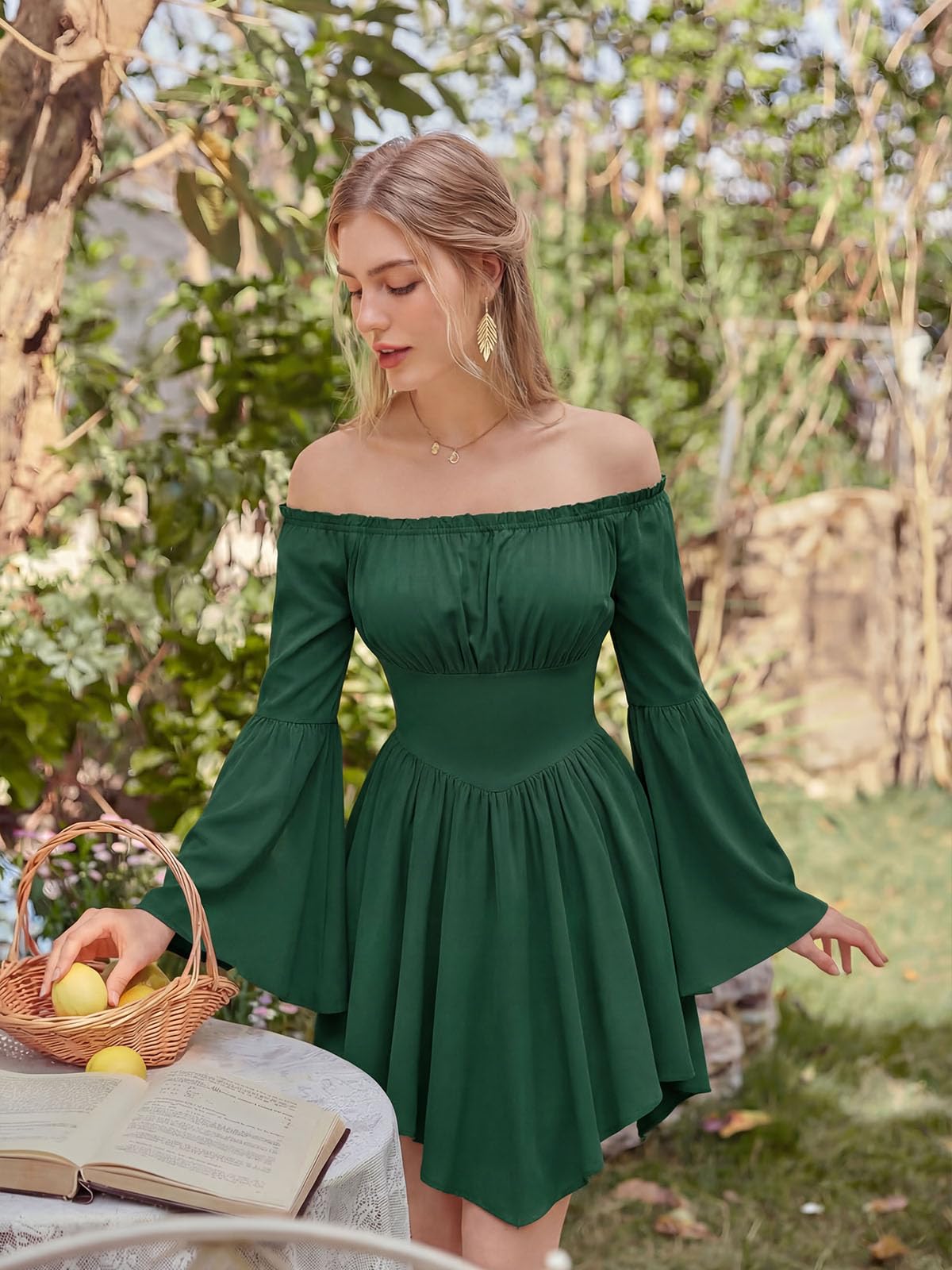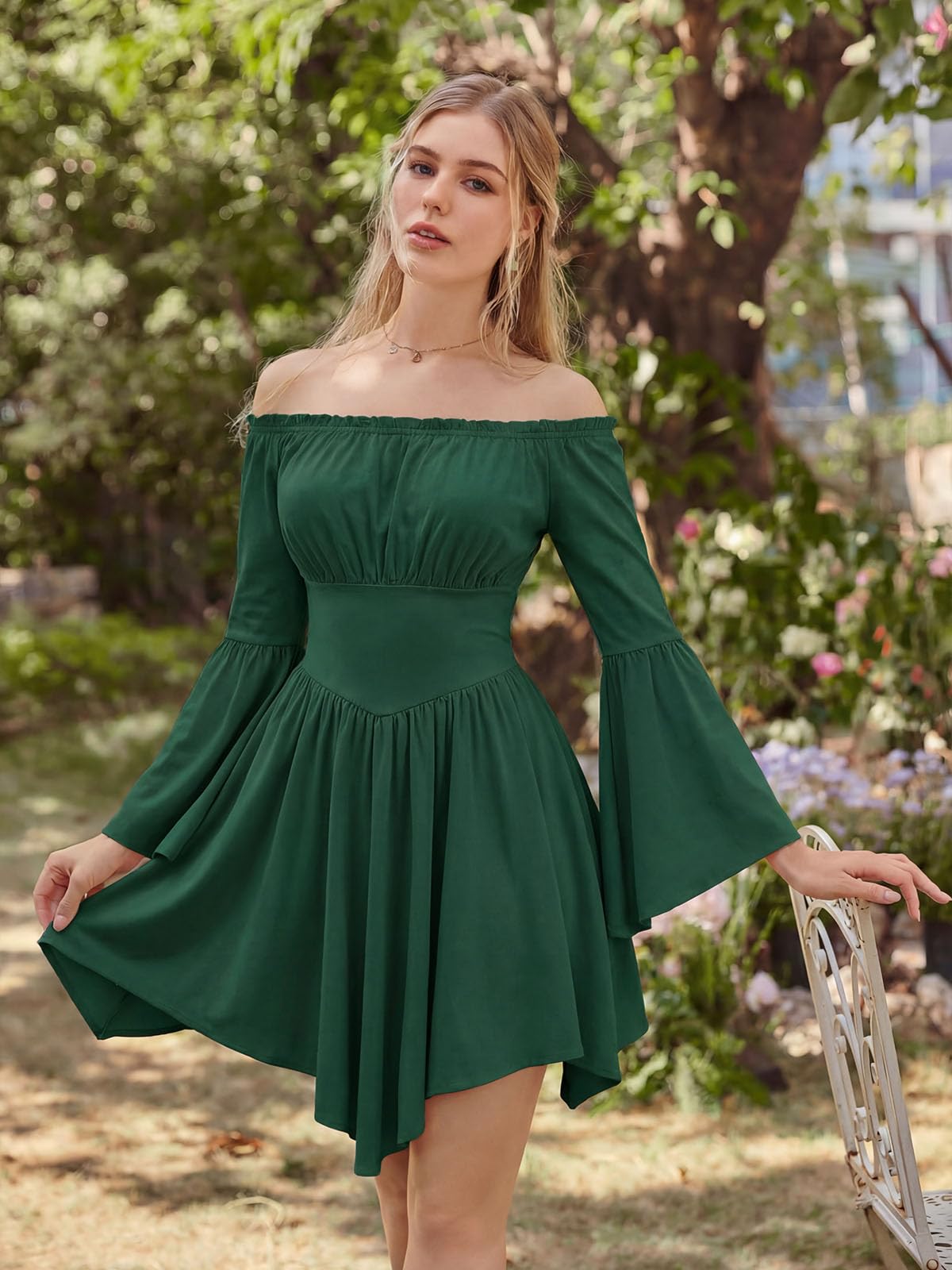 INSPIRATION - This women's off-shoulder dress features a stunning Renaissance-inspired irregular hem and beautiful agaric lace decoration at the neckline, creating a romantic and feminine silhouette