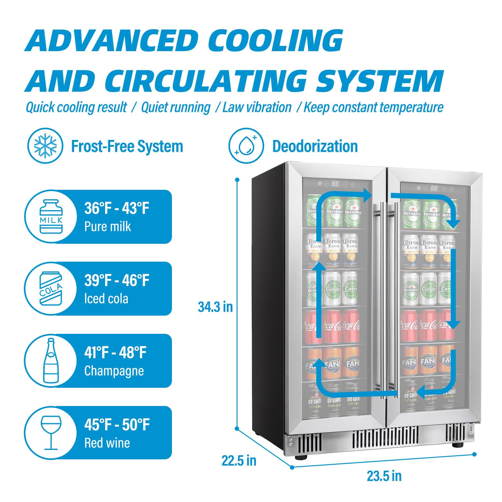 Dual Zone Temperature Control â This wine and beverage refrigerator features two independent cooling zones. Set the left zone (wine) between 37°Fâ40°F and the right zone (beverages) from 41°Fâ64°F for optimal storage of wine, soda, beer, or water.