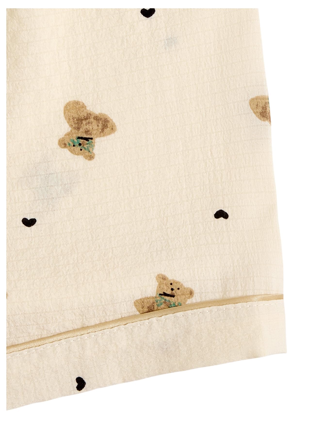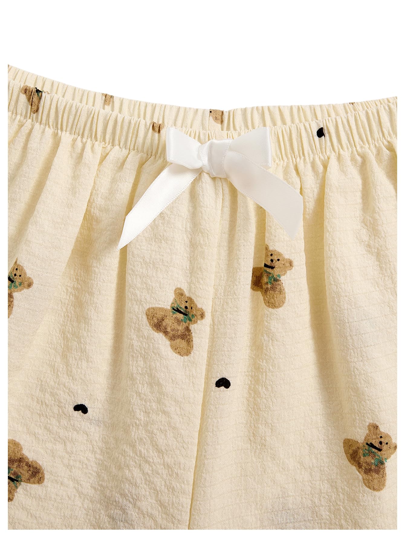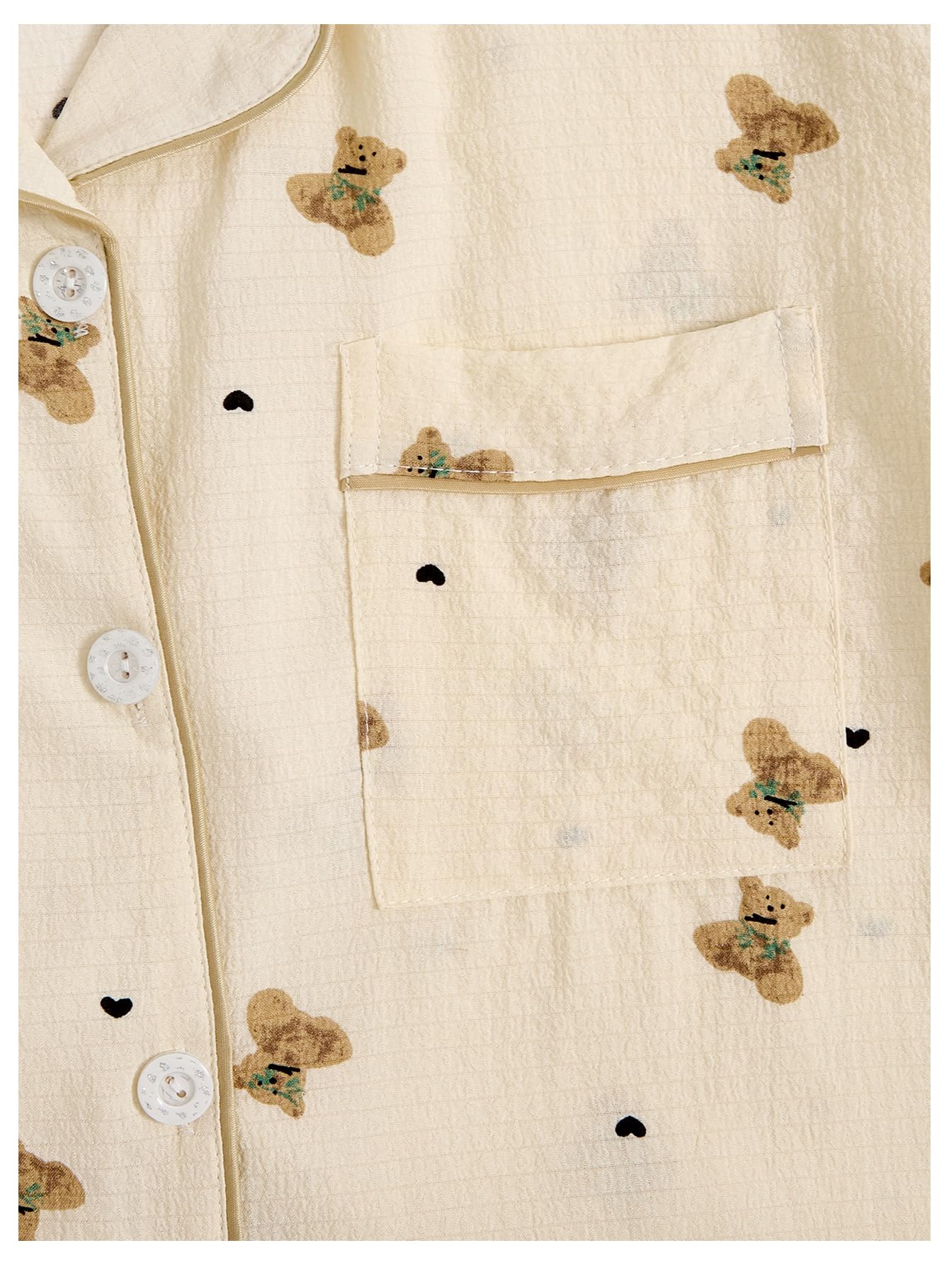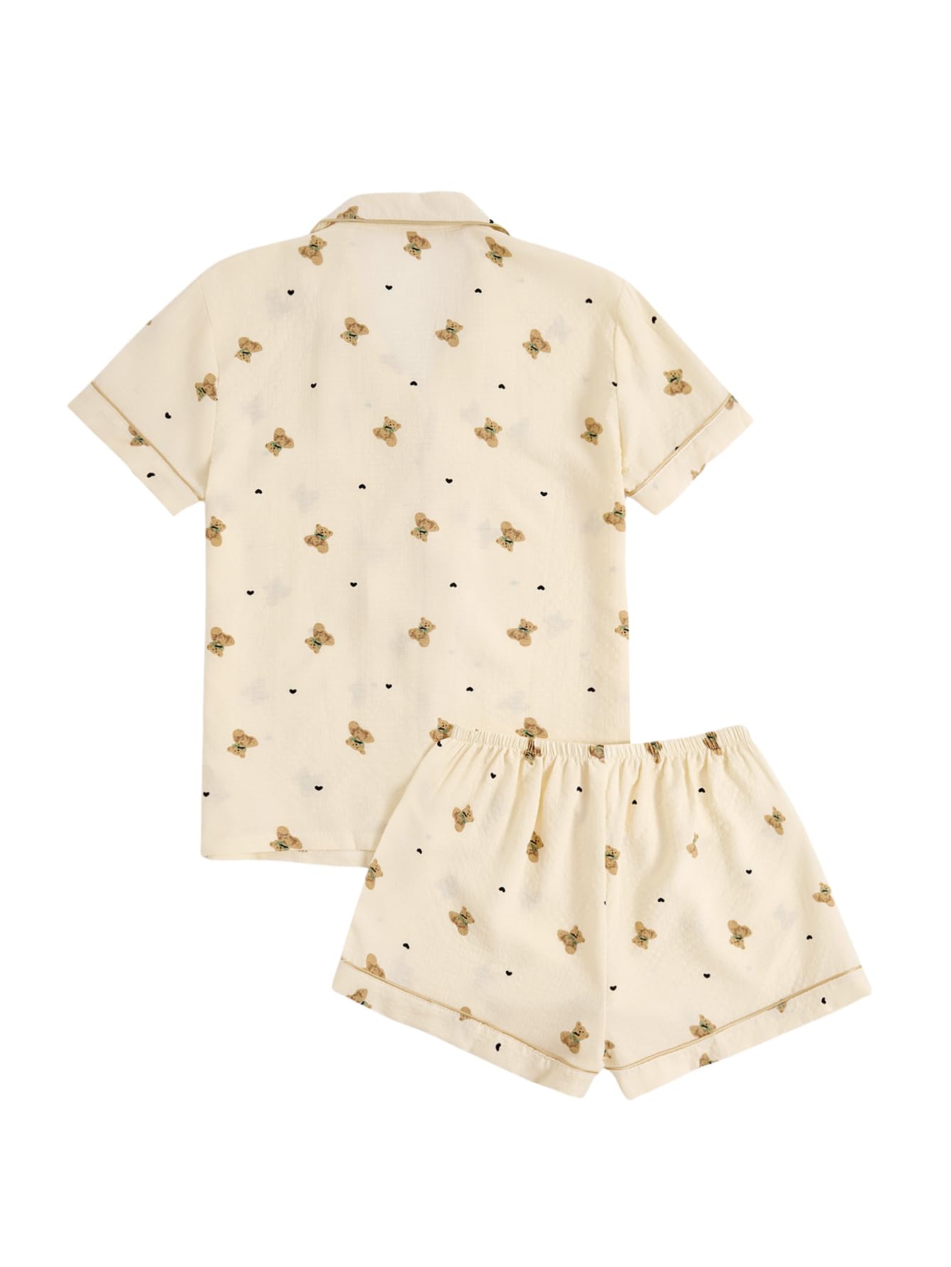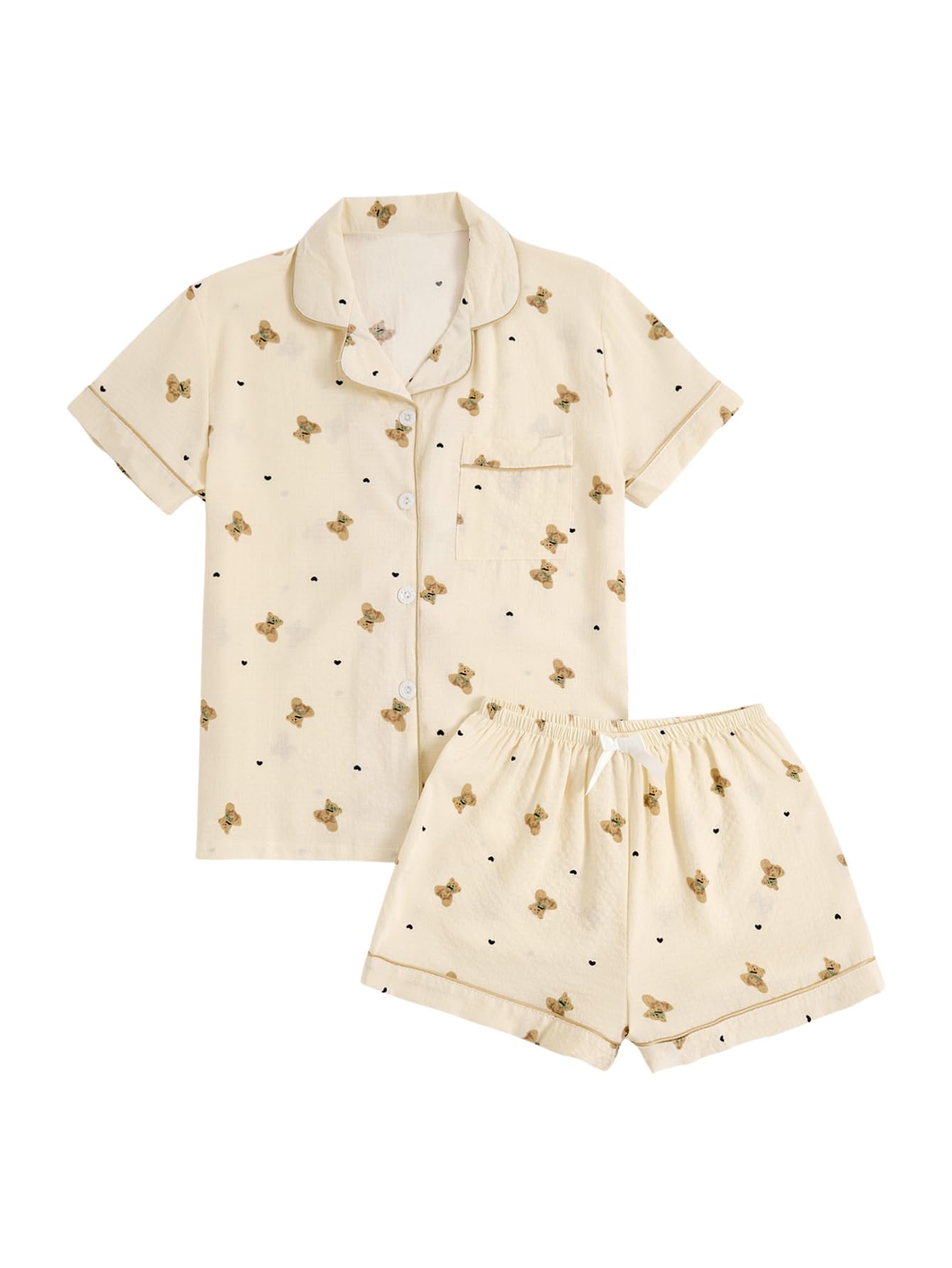 Lapel Collar, Short Sleeve, Print Pajamas, Bow Decoration, Button Down Top and Shorts, Loungewear Sets, Women's Sleepwear.