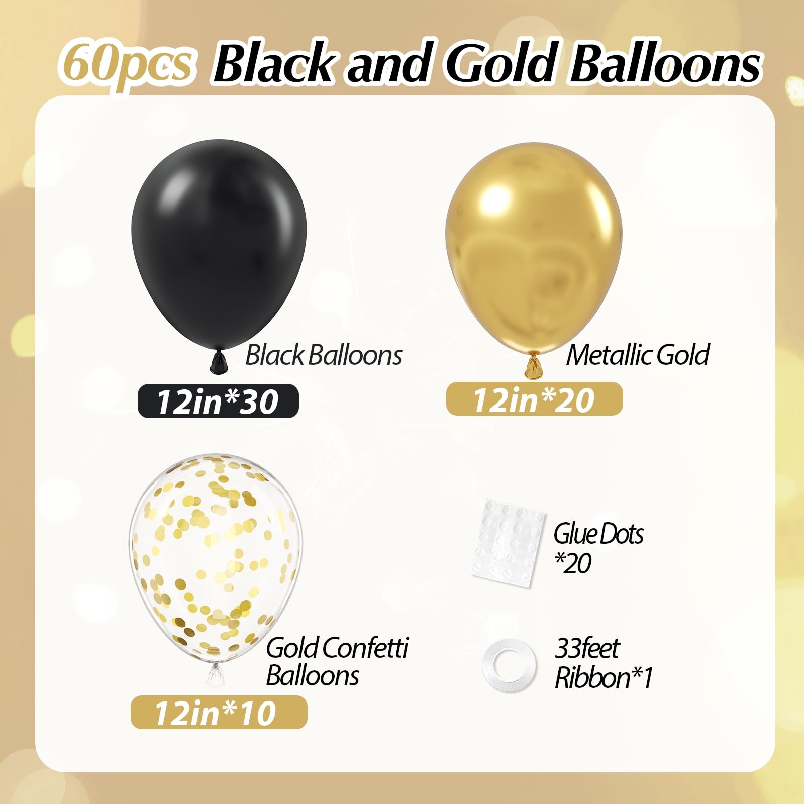 Package Include: 12inch black balloons x30, 12inch metallic gold balloons x20, 12inch gold confetti balloons x10, ribbon x1, glue dotx20