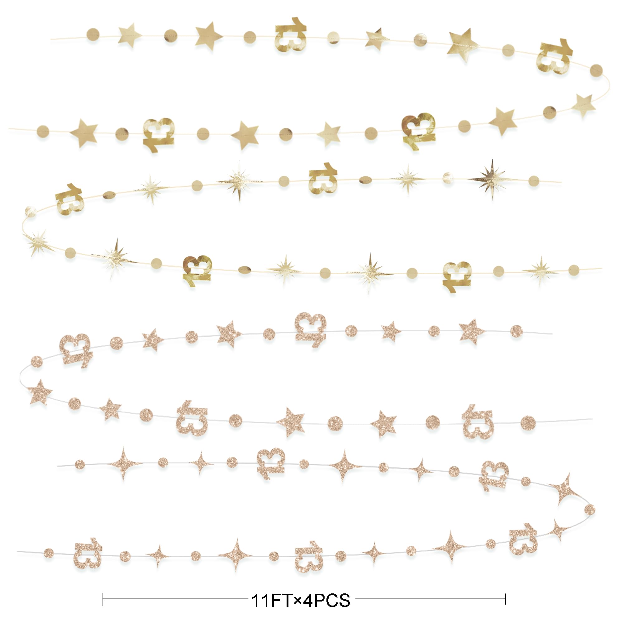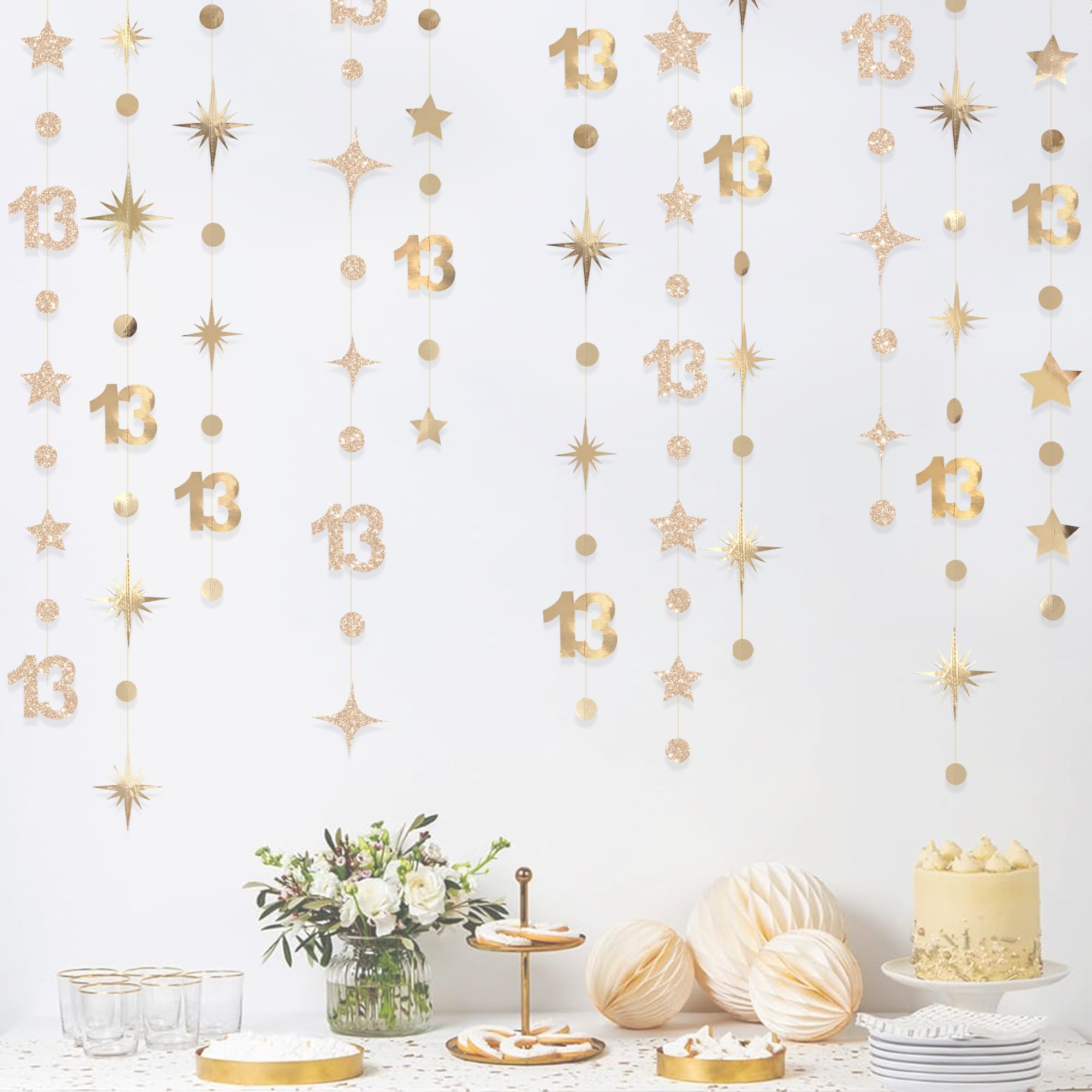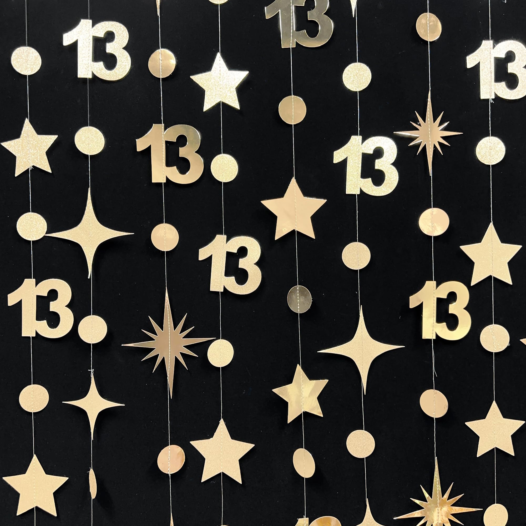 👍 Package includes - 4 strings of 11.5 feet/3.5 meters metallic and glitter champagne gold number 13 sparkling twinkle star and circle dots garlands , totally is 46 feet/14 meters