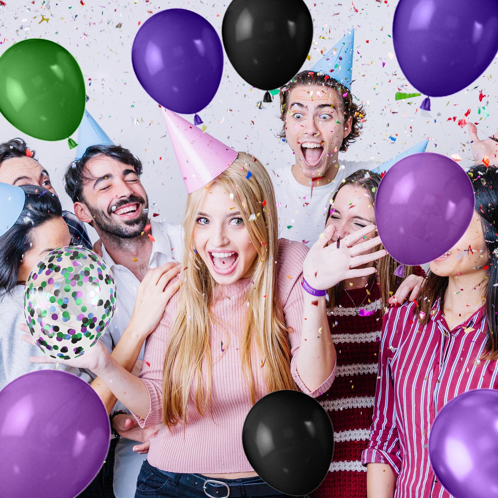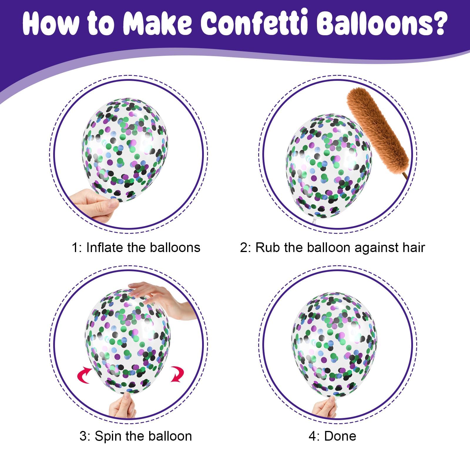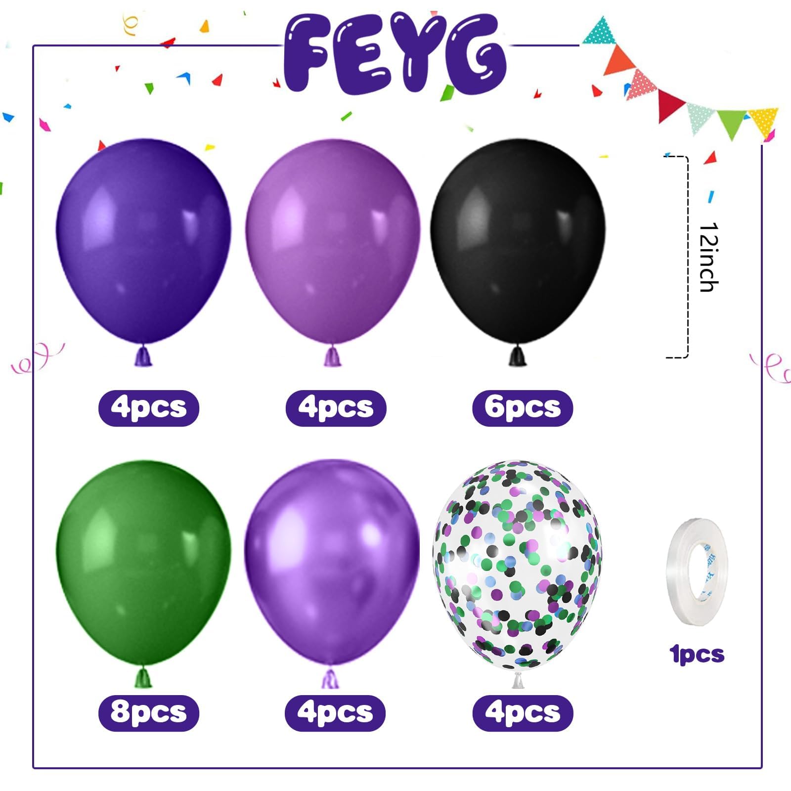 Green Purple Black Balloons Kit:30pcs 12 inch balloons, including 4 black purple balloons,4 pearl purple balloons,6 black balloons,8 dark green balloons,4 metallic purple balloons,4 black purple green blue confetti balloons,1 white ribbons 10 meters long.