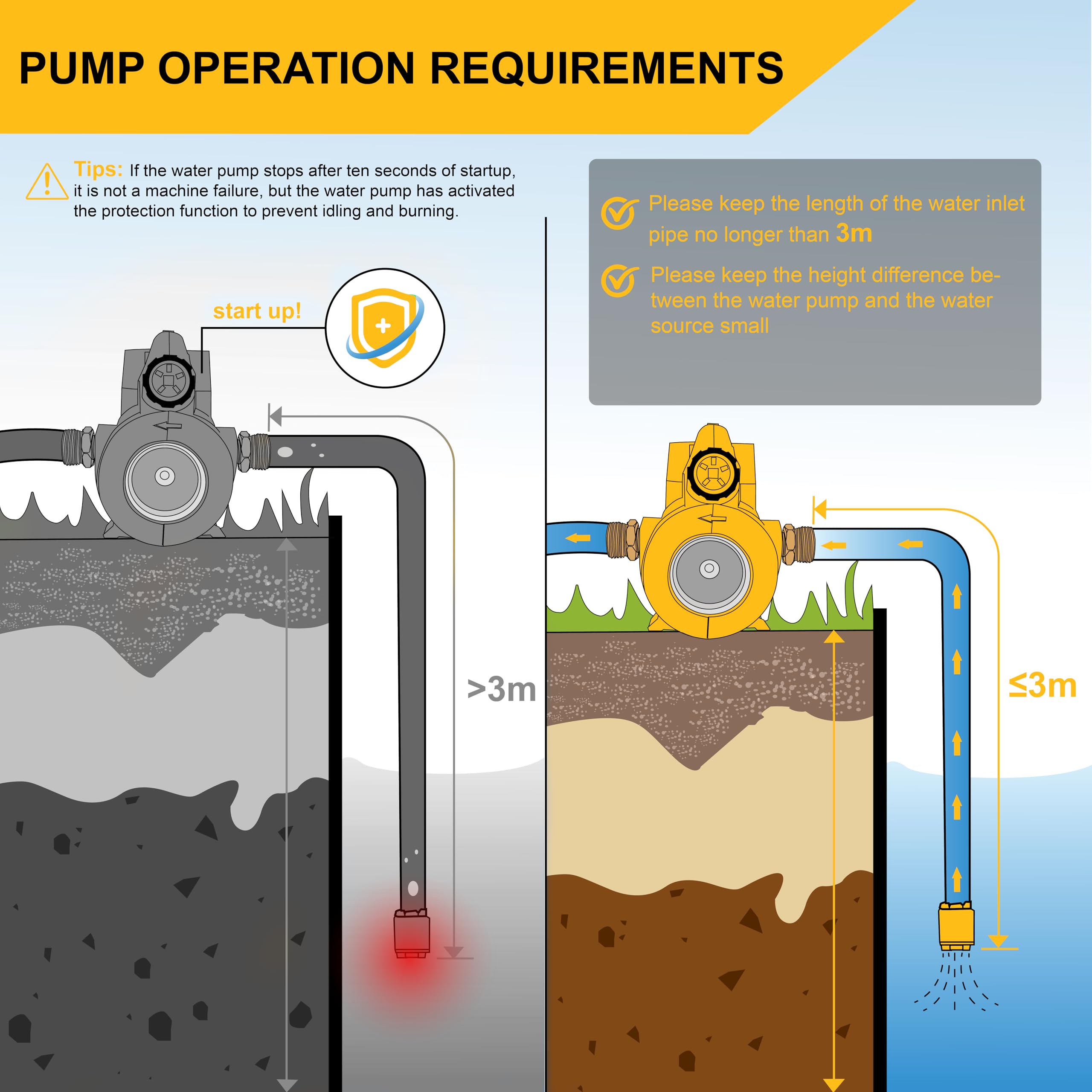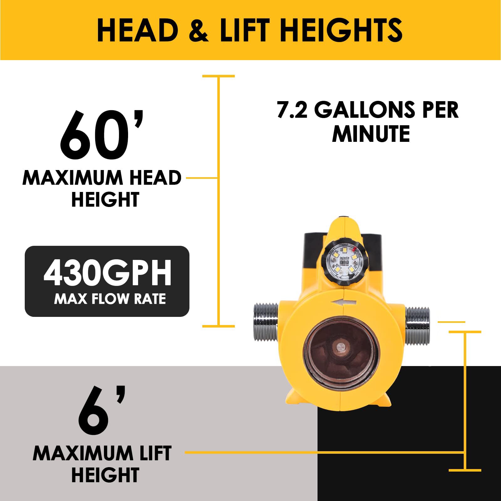 Self-Priming Transfer Pump: With the innovative self-priming pump, you can connect and go quicker than ever. The Mellif mini utility transfer pump's flexible impeller and powerful pump move water at up to 430 Gal.per hour. Max head height: 60 FT, Max suction lift: 6 FT, Max flow: 430 GPH