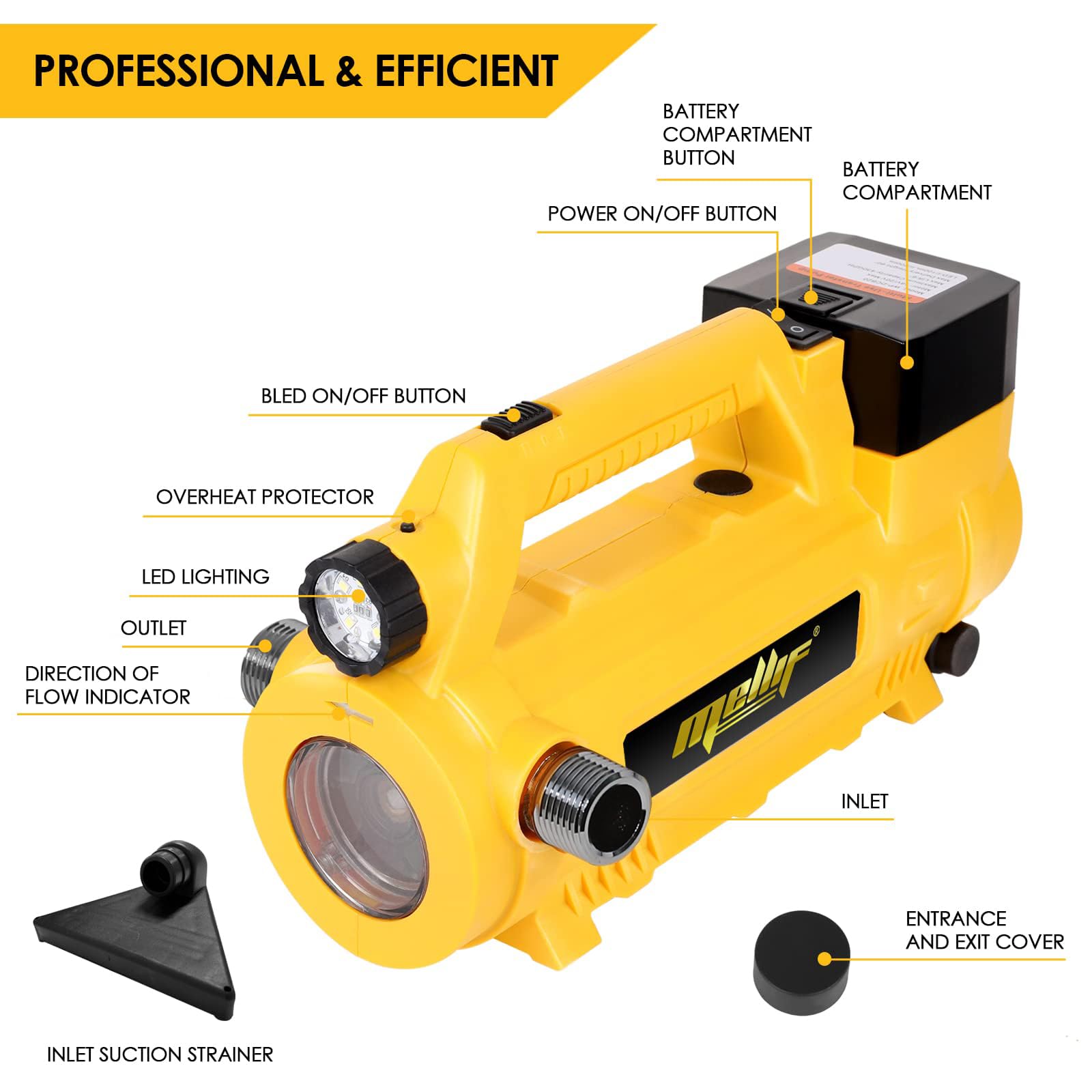 Cordless Battery Powered Water Pump: Mellif transfer pump is compatible with dewalt 20V battery (Battery and Charger NOT Included). Search for ASIN: B0CKXL5CJS if you are looking for replacement Impeller