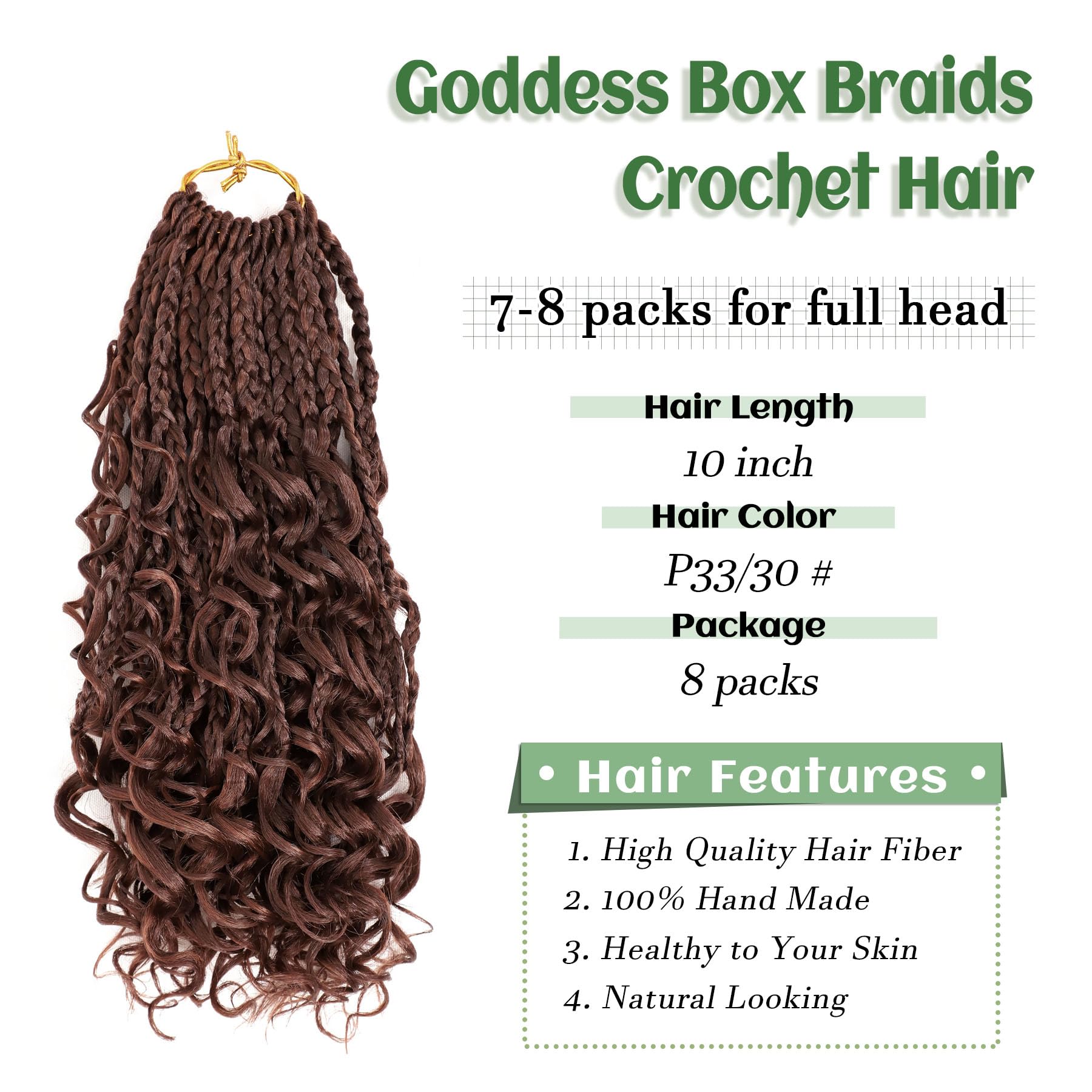 Hair Length and Package: goddess box braids crochet hair is 10 inch, 12 inch and 14 inch,18 inch and 24 inch, 8-9 packs are enough to make a full head. Hair Color:1B, #2 , #27 , #30 , 1B /27 color, 1B/30, T30/27,T30/613,Tgray color, 1B/Burgundy and T1B/blue color. More colors are available.